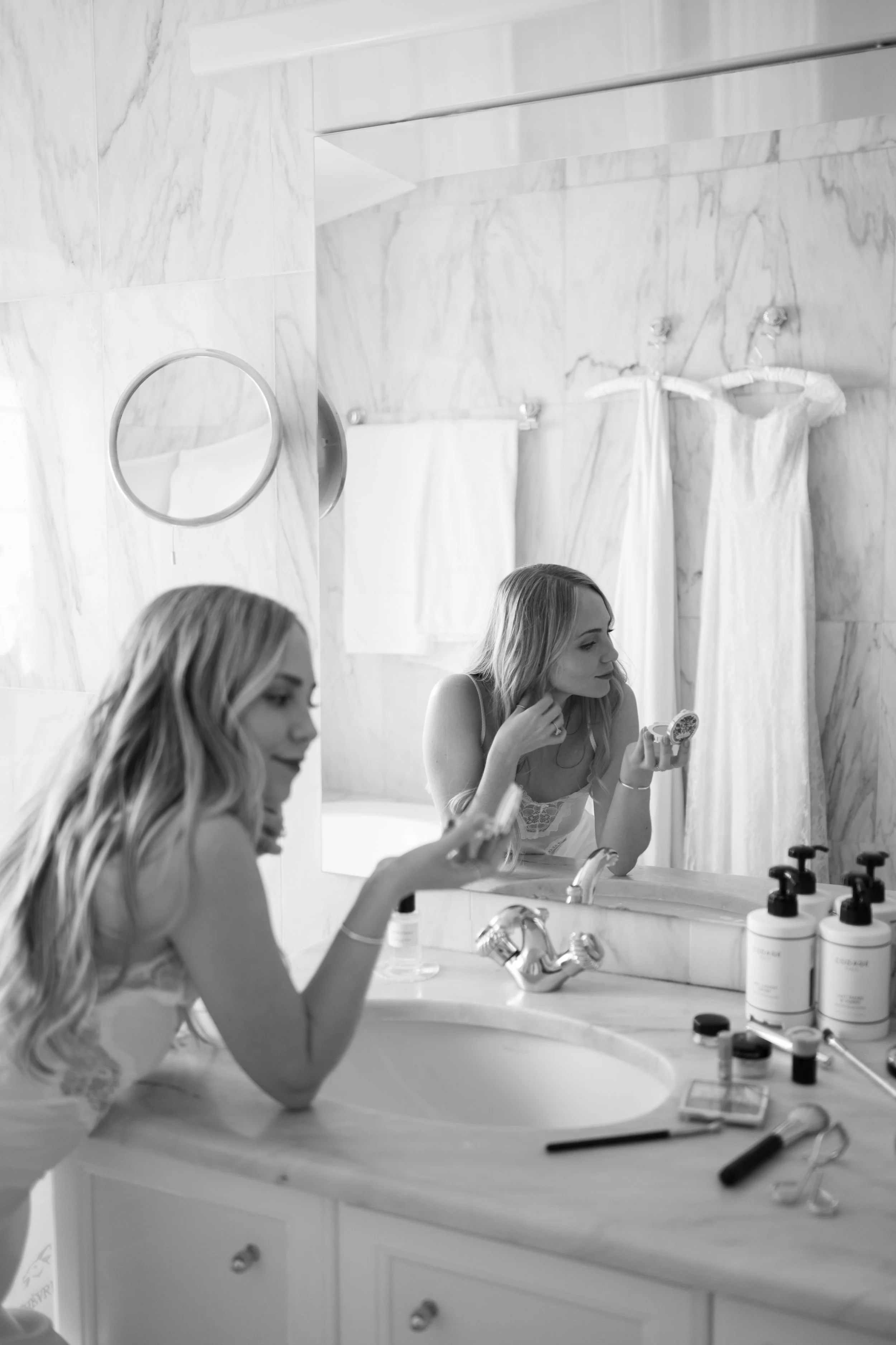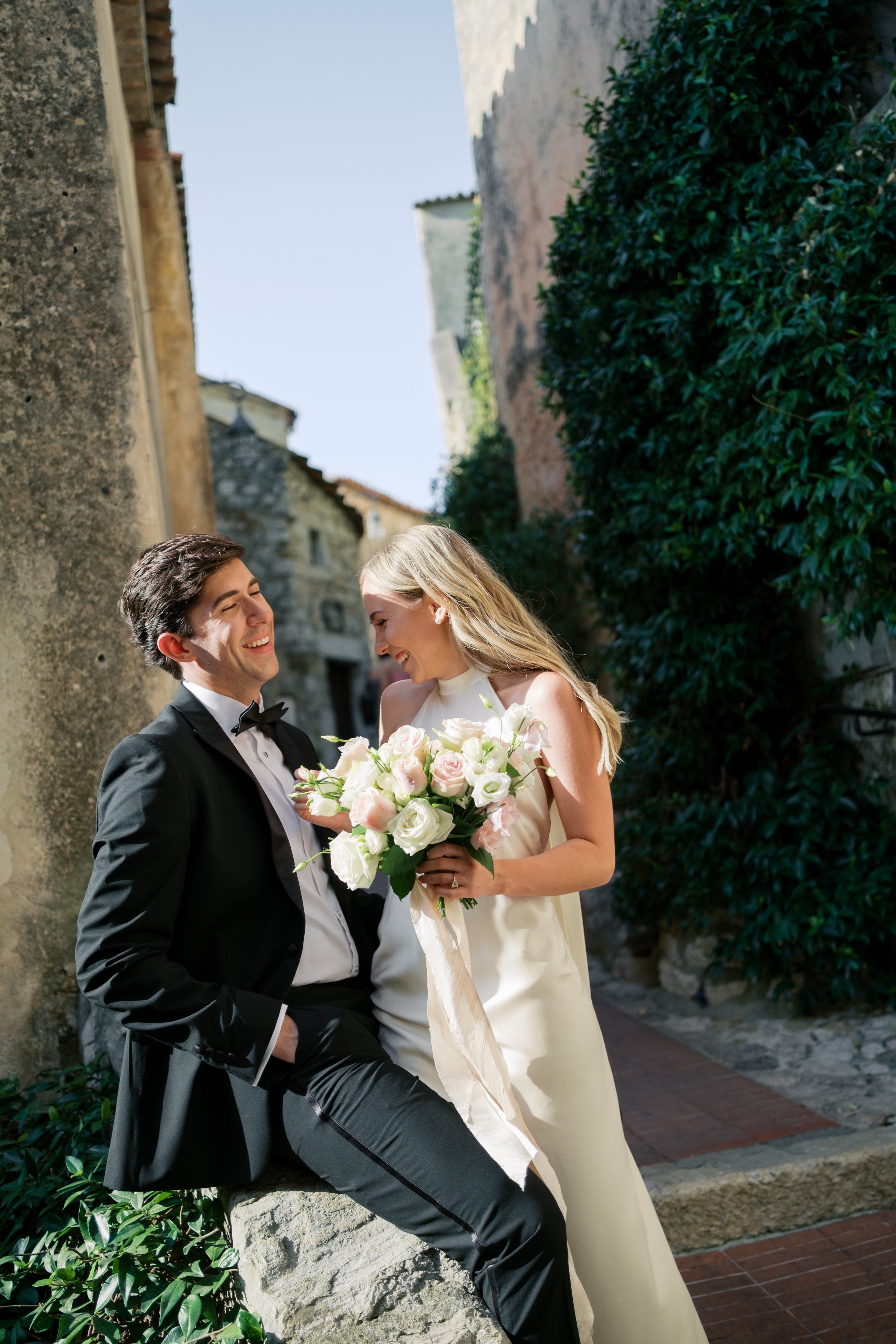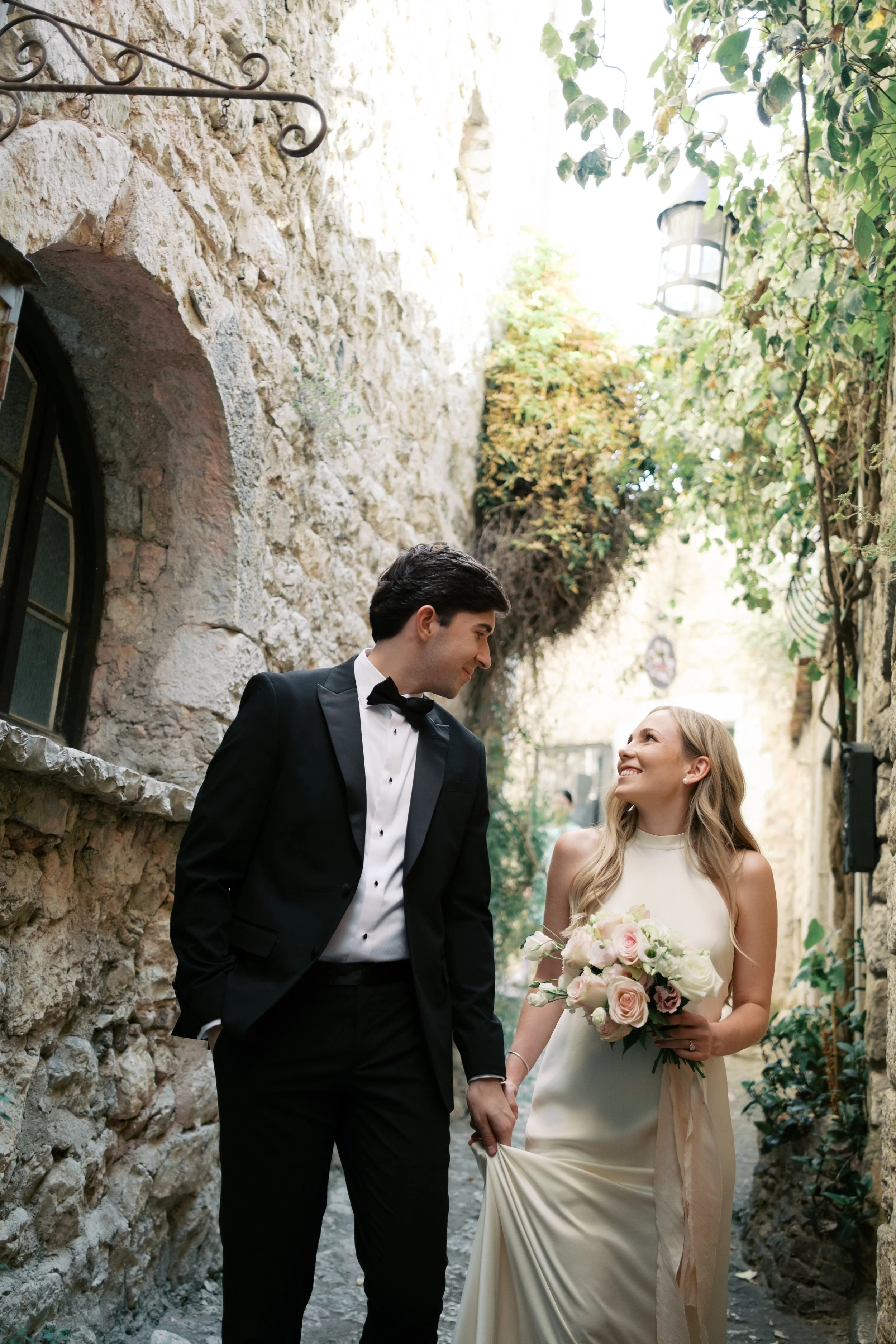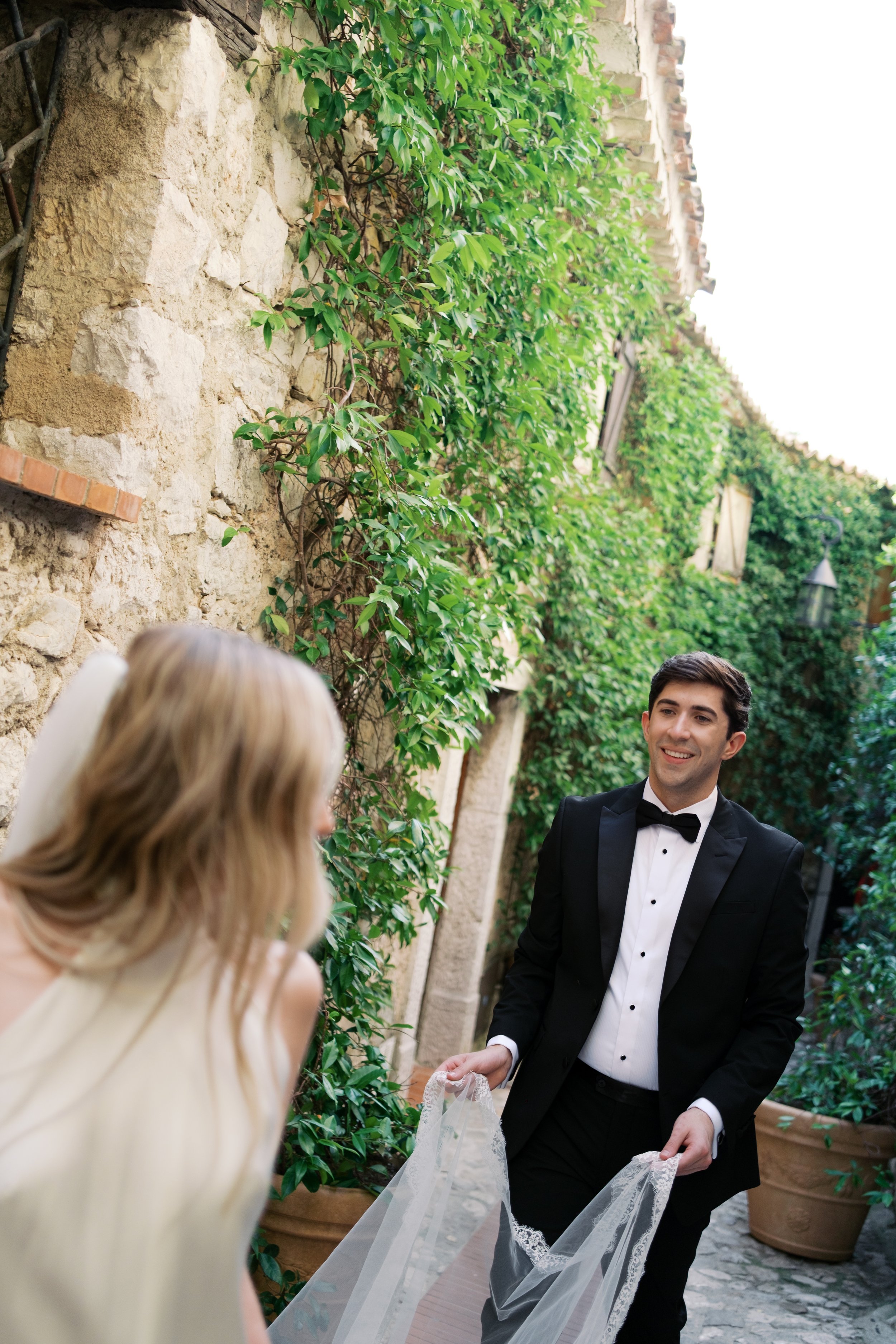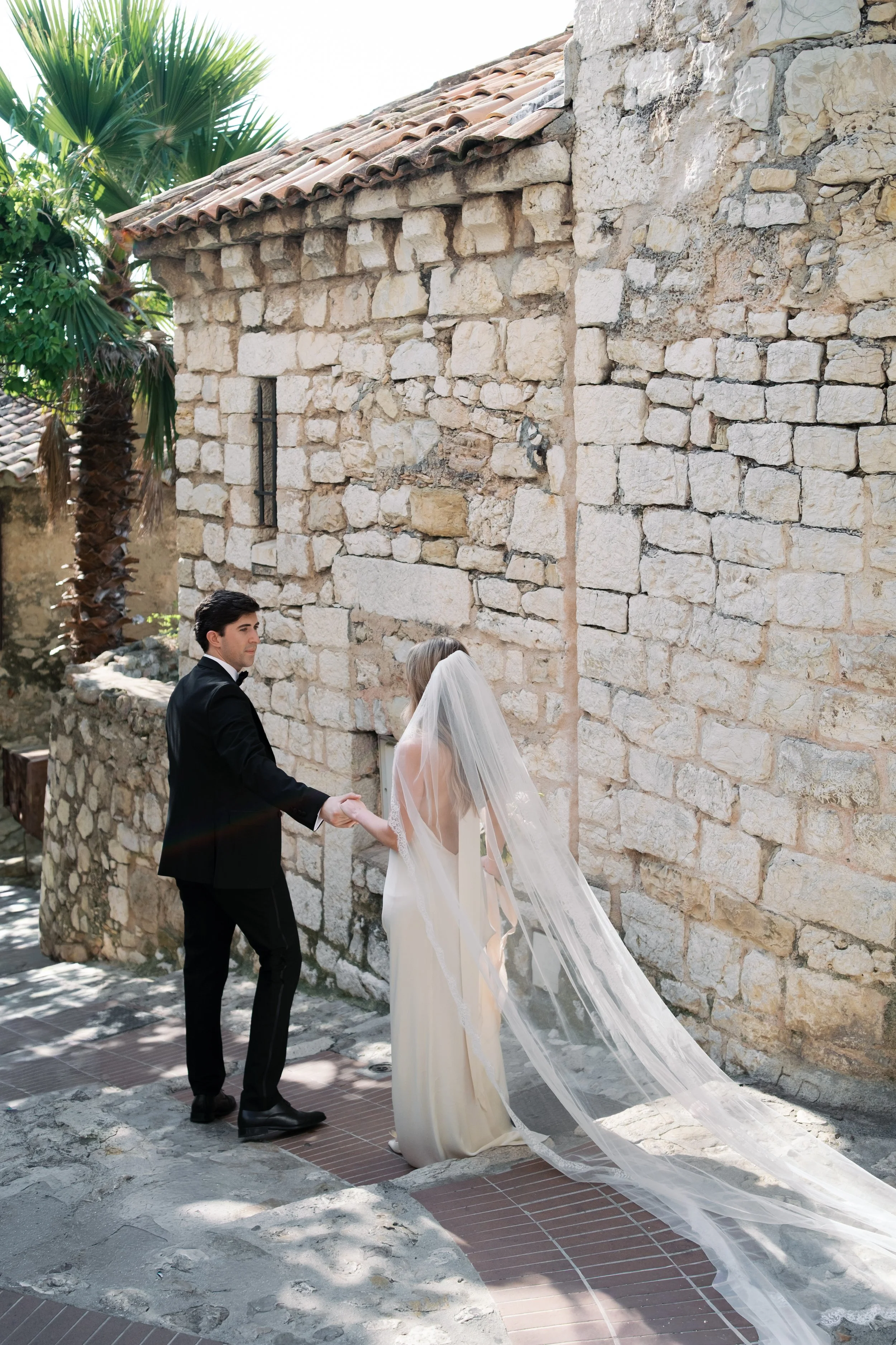 Despite starting well before sunrise, it’s probably no surprise that our wedding day wasn’t hard to wake up for. I got ready on our room’s deck with a view of the sunrise over the Mediterranean (which felt exactly how it sounds). The sun was sparkling over the water while I powdered eyeshadows and blushes to work on my own bridal glow. I was so relaxed that I ran a bit late for photos in the village! When we got back from the village, we captured these portraits in our pink, marble, bathroom while I did a round of touch ups on my face and hair. We laughed off my hair’s unwillingness to hold a curl regardless of the can of hair spray I ran through that morning. It gave us a chance to embrace the French c'est la vie, and roll out with a carefree version of bridal hair.