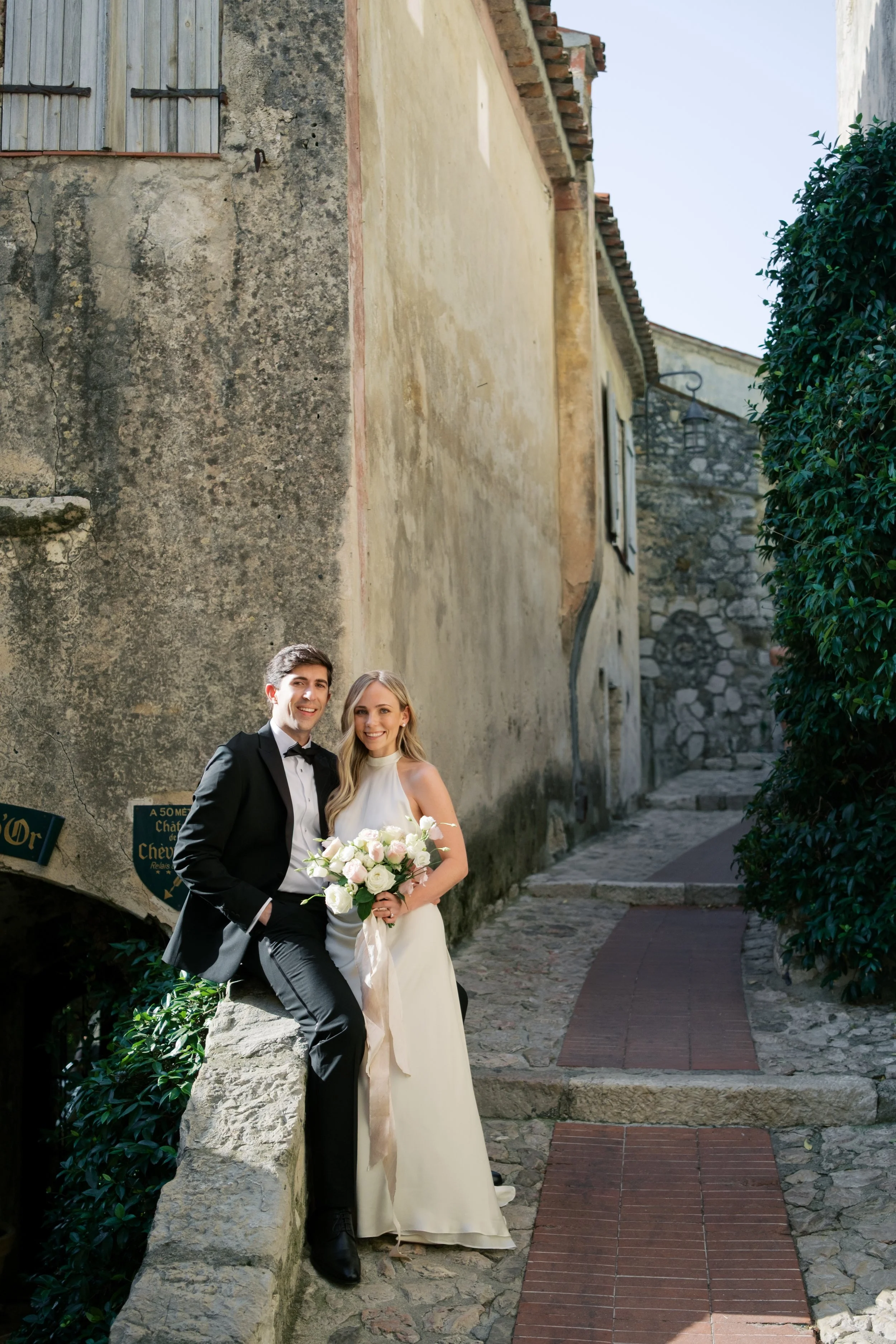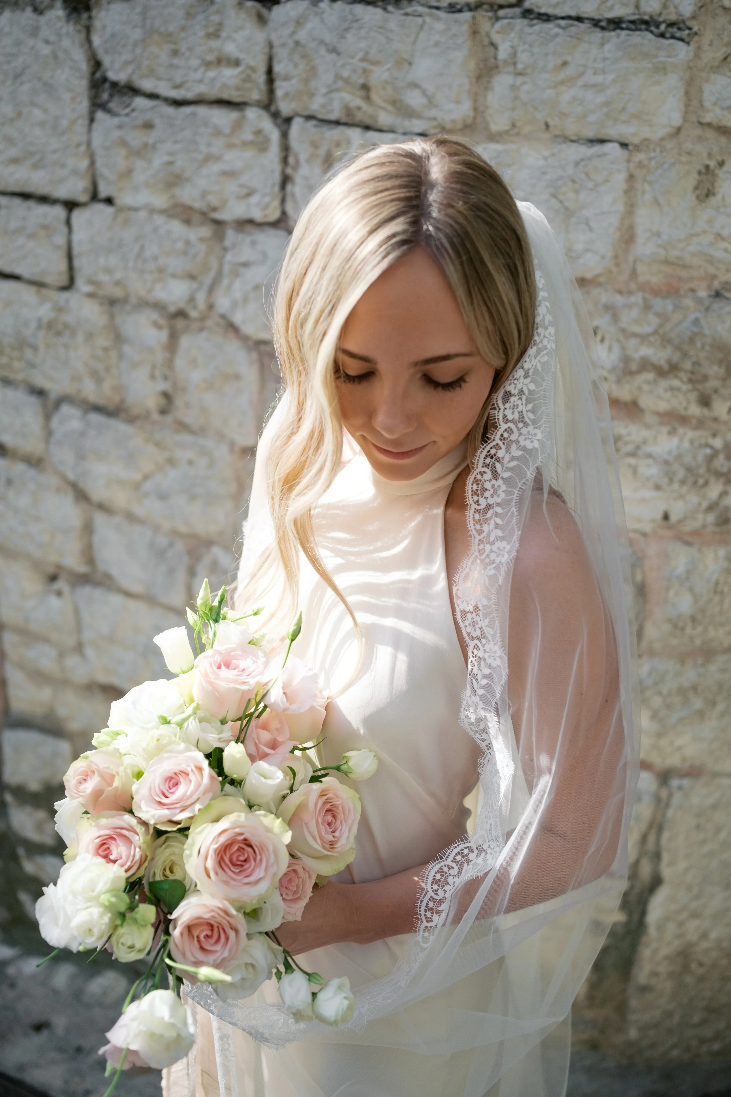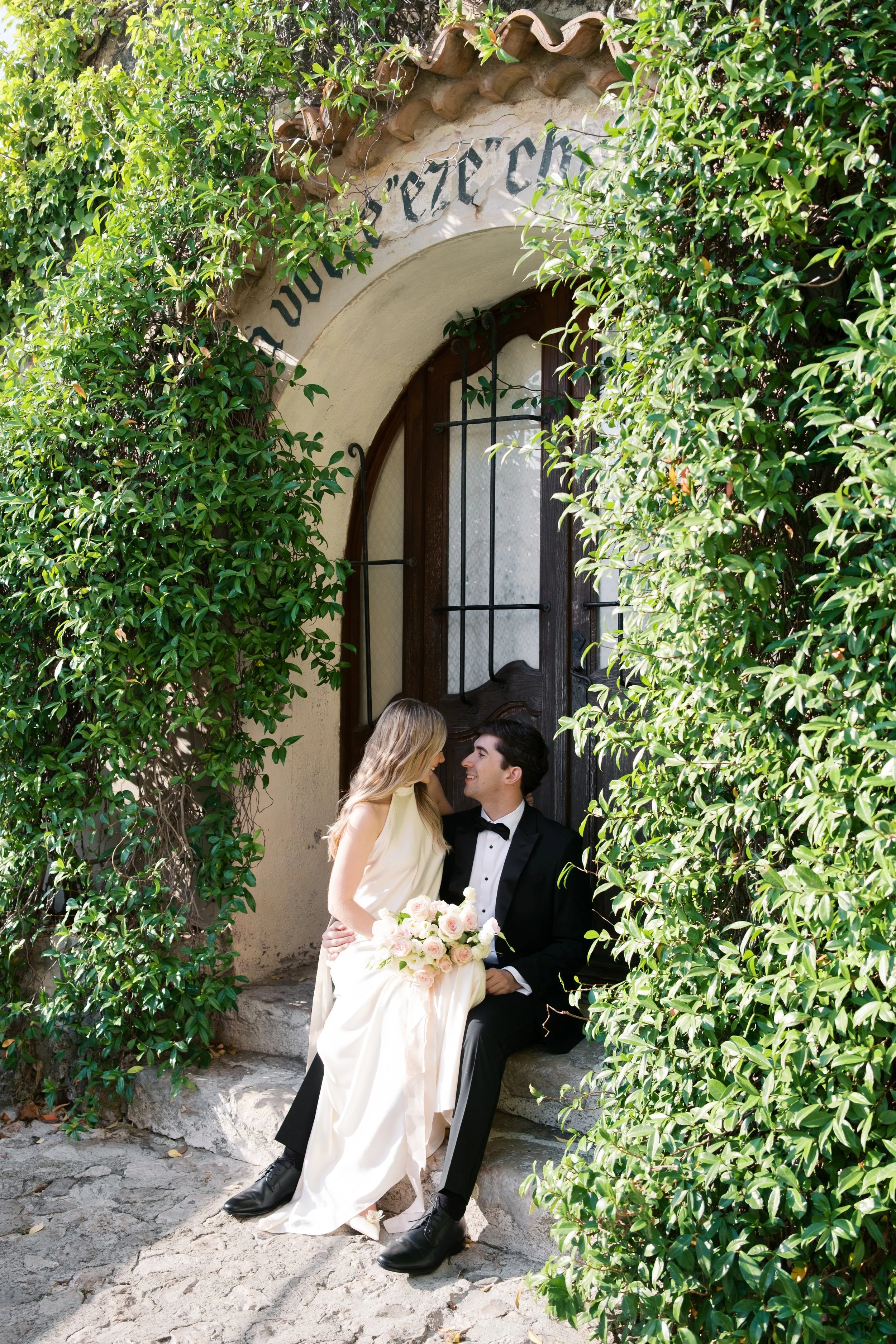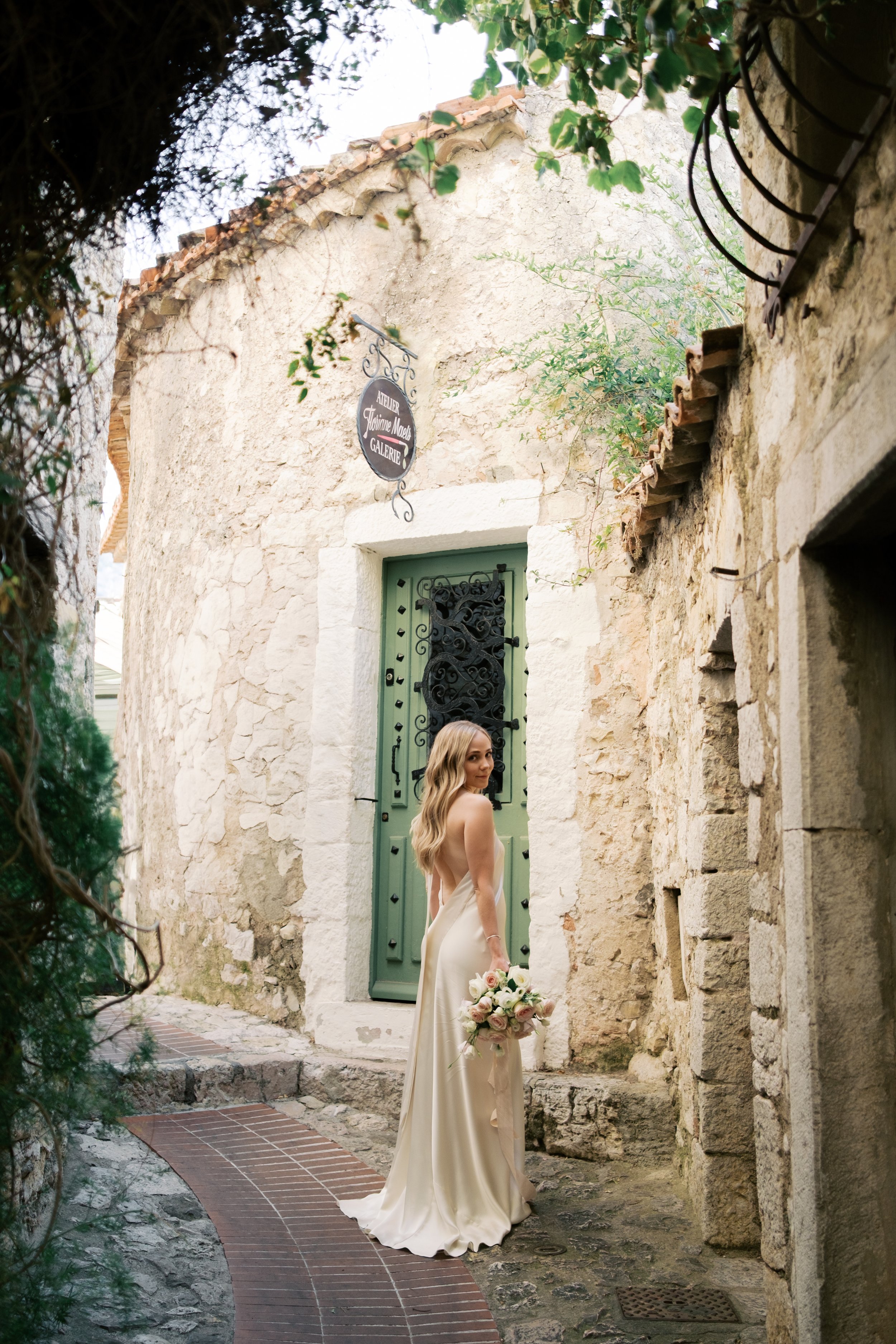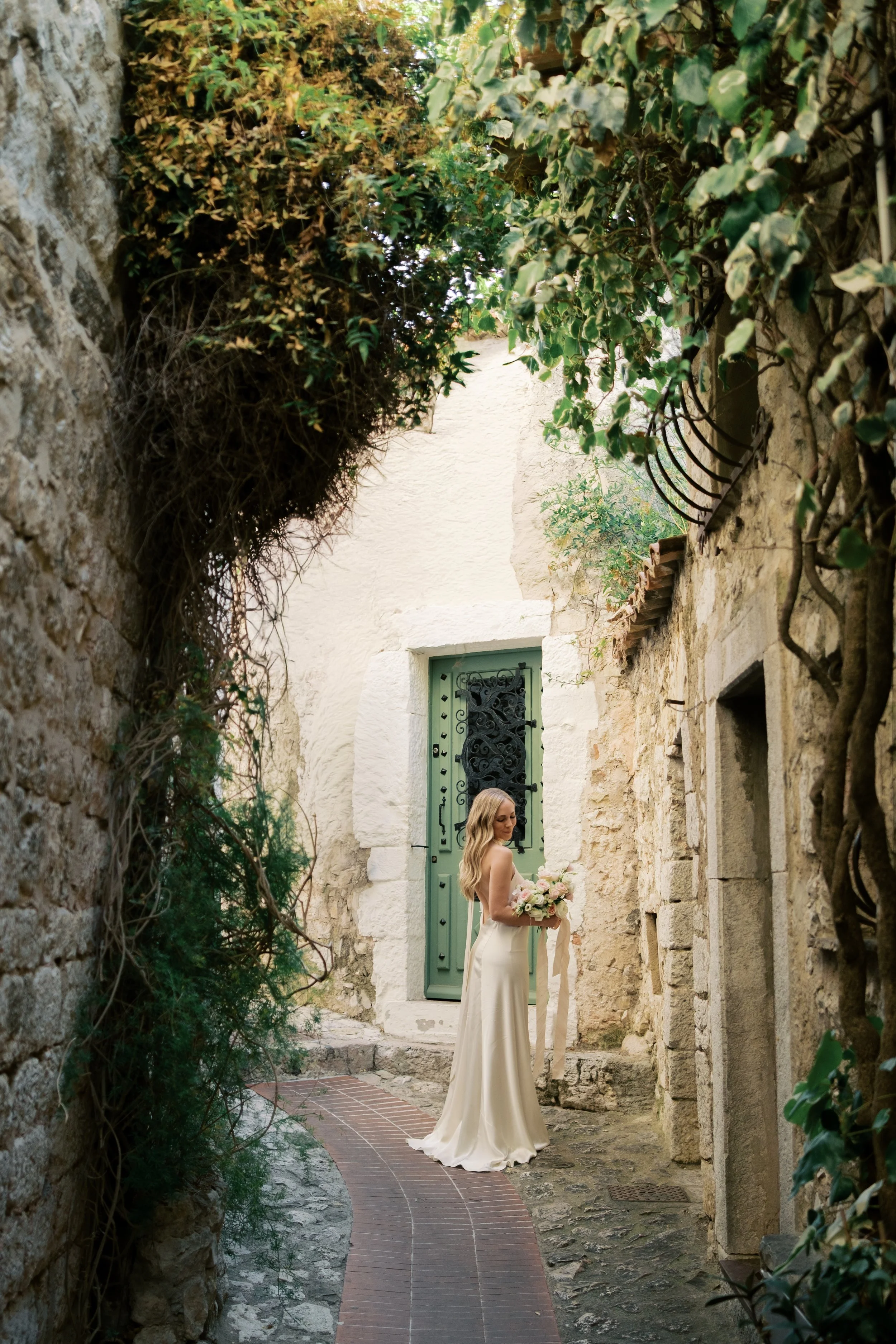 Despite starting well before sunrise, it’s probably no surprise that our wedding day wasn’t hard to wake up for. I got ready on our room’s deck with a view of the sunrise over the Mediterranean (which felt exactly how it sounds). The sun was sparkling over the water while I powdered eyeshadows and blushes to work on my own bridal glow. I was so relaxed that I ran a bit late for photos in the village! When we got back from the village, we captured these portraits in our pink, marble, bathroom while I did a round of touch ups on my face and hair. We laughed off my hair’s unwillingness to hold a curl regardless of the can of hair spray I ran through that morning. It gave us a chance to embrace the French c'est la vie, and roll out with a carefree version of bridal hair.