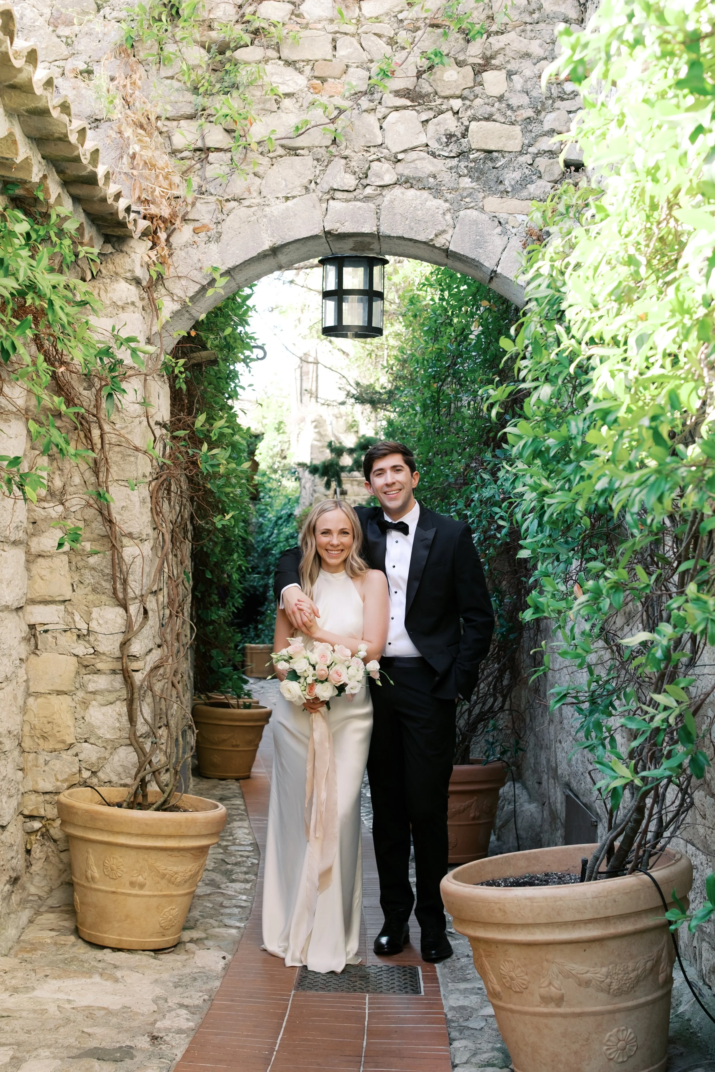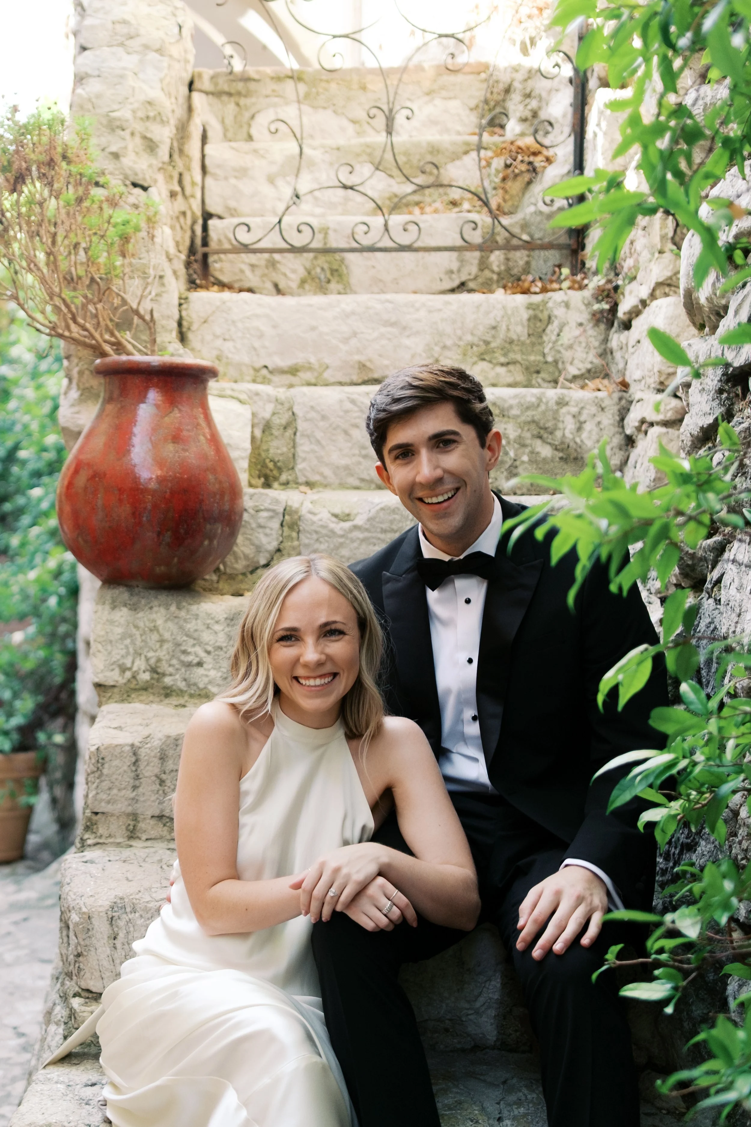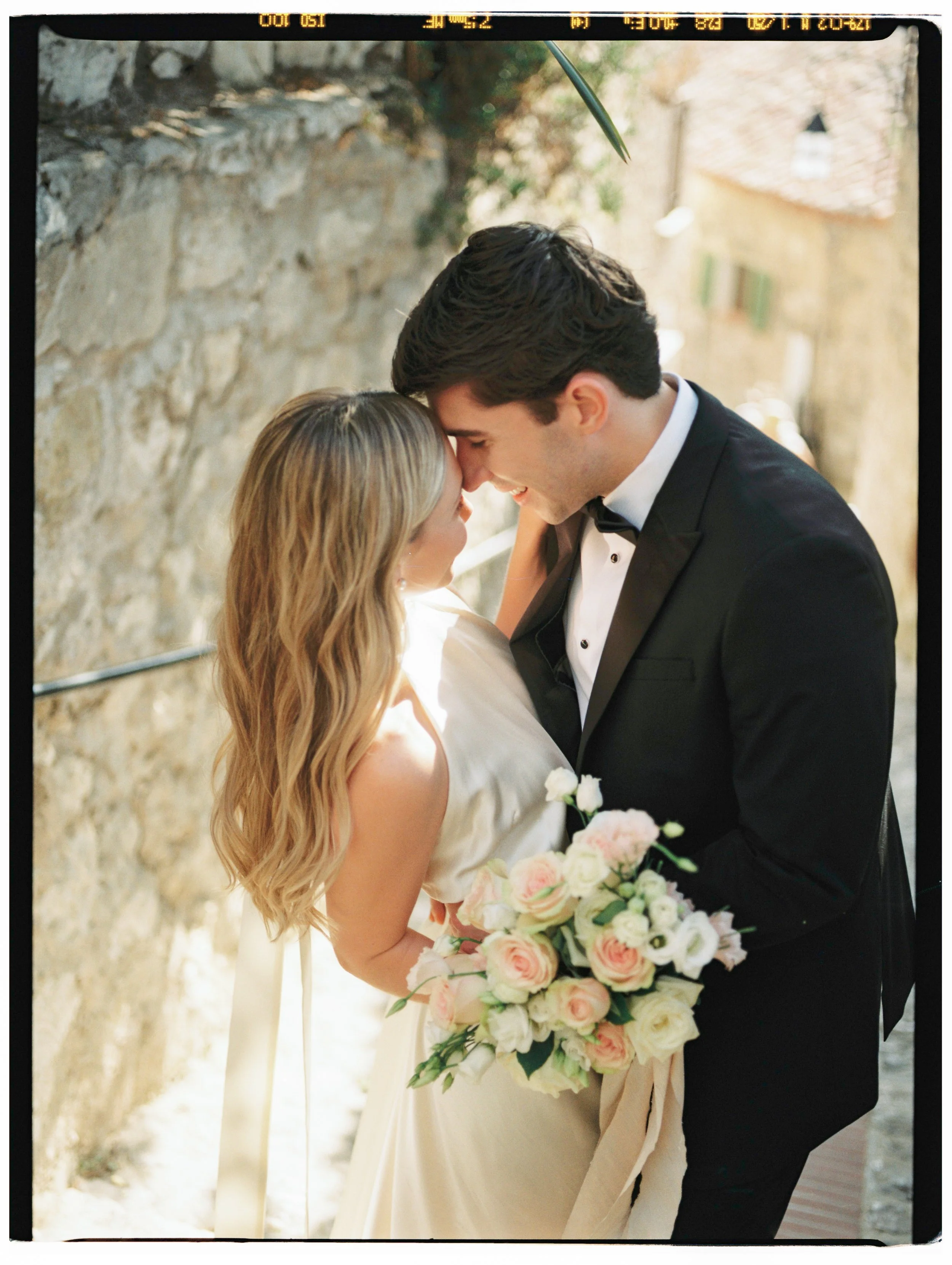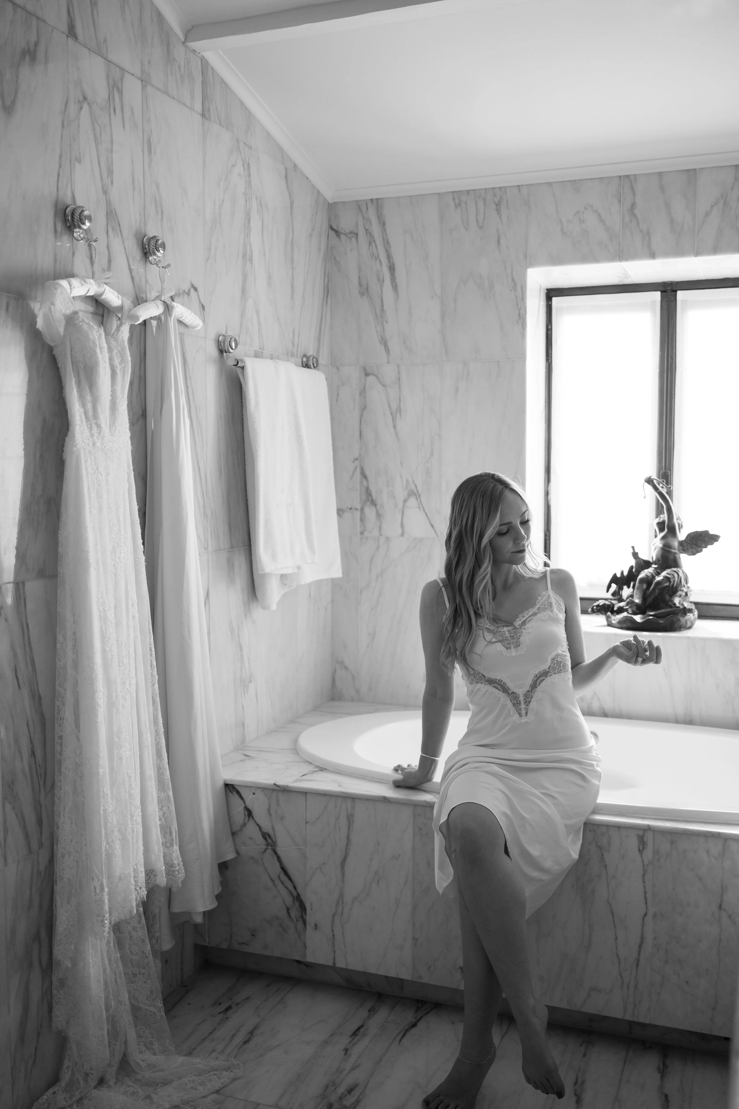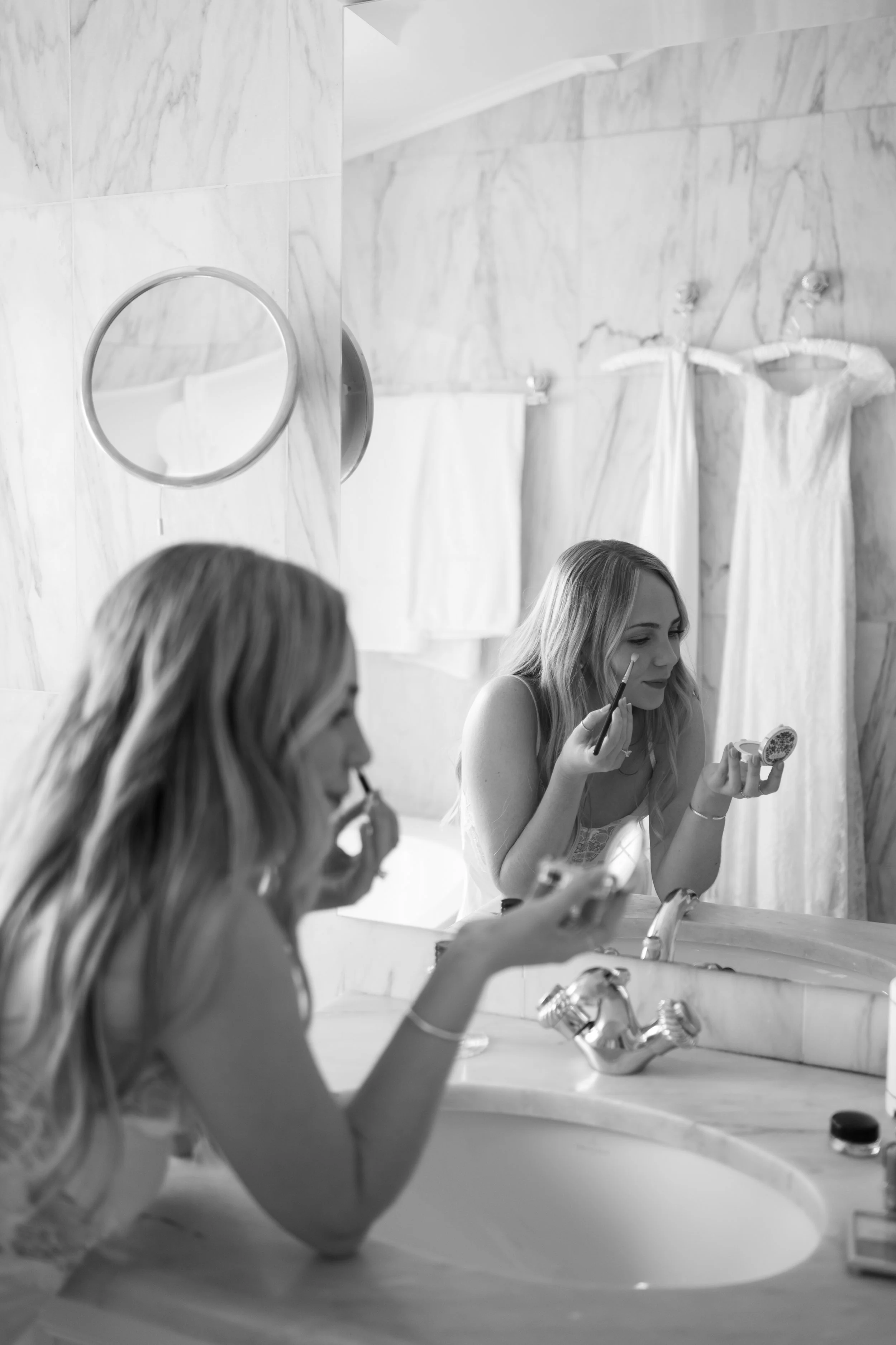 Despite starting well before sunrise, it’s probably no surprise that our wedding day wasn’t hard to wake up for. I got ready on our room’s deck with a view of the sunrise over the Mediterranean (which felt exactly how it sounds). The sun was sparkling over the water while I powdered eyeshadows and blushes to work on my own bridal glow. I was so relaxed that I ran a bit late for photos in the village! When we got back from the village, we captured these portraits in our pink, marble, bathroom while I did a round of touch ups on my face and hair. We laughed off my hair’s unwillingness to hold a curl regardless of the can of hair spray I ran through that morning. It gave us a chance to embrace the French c'est la vie, and roll out with a carefree version of bridal hair.