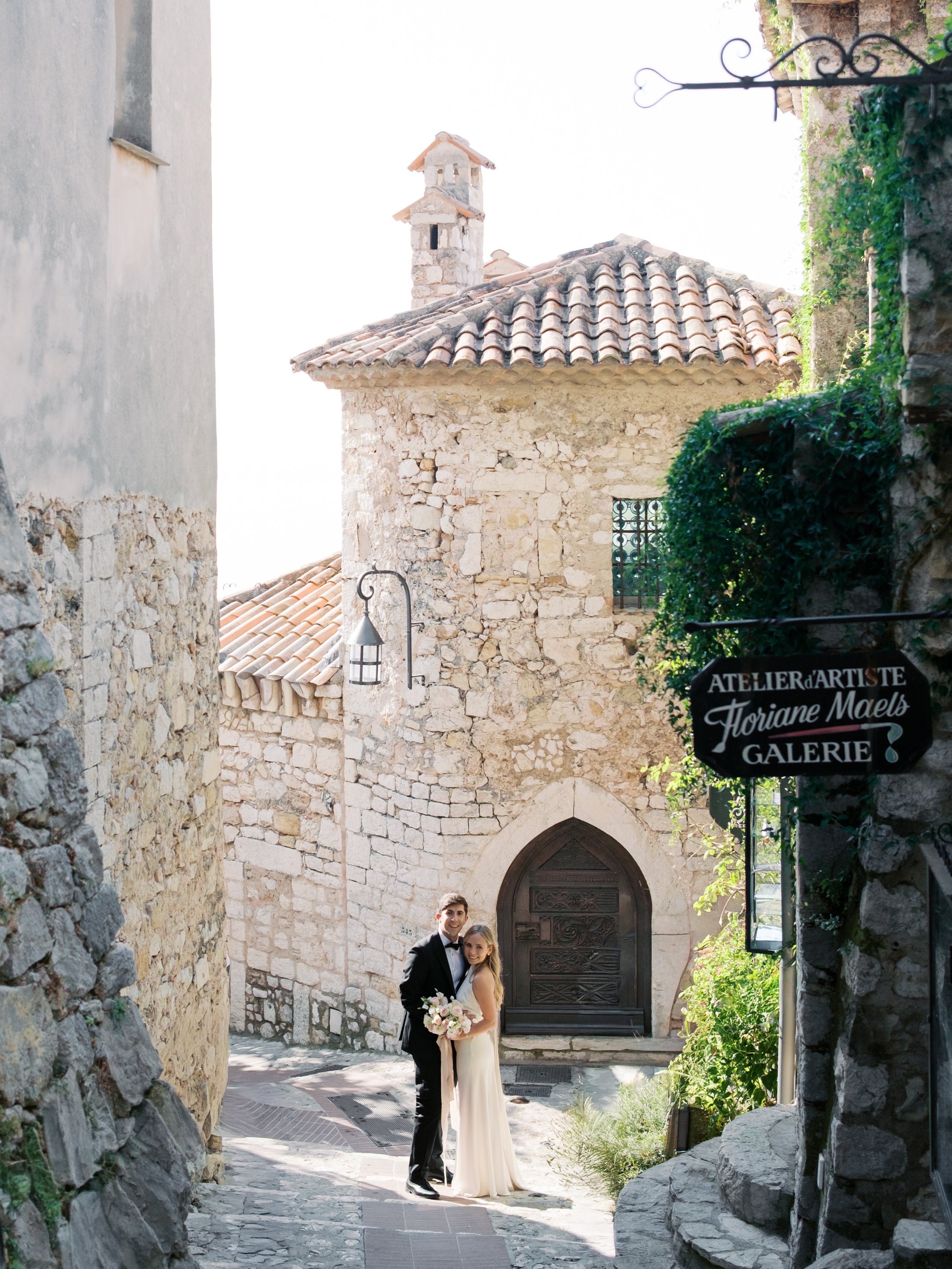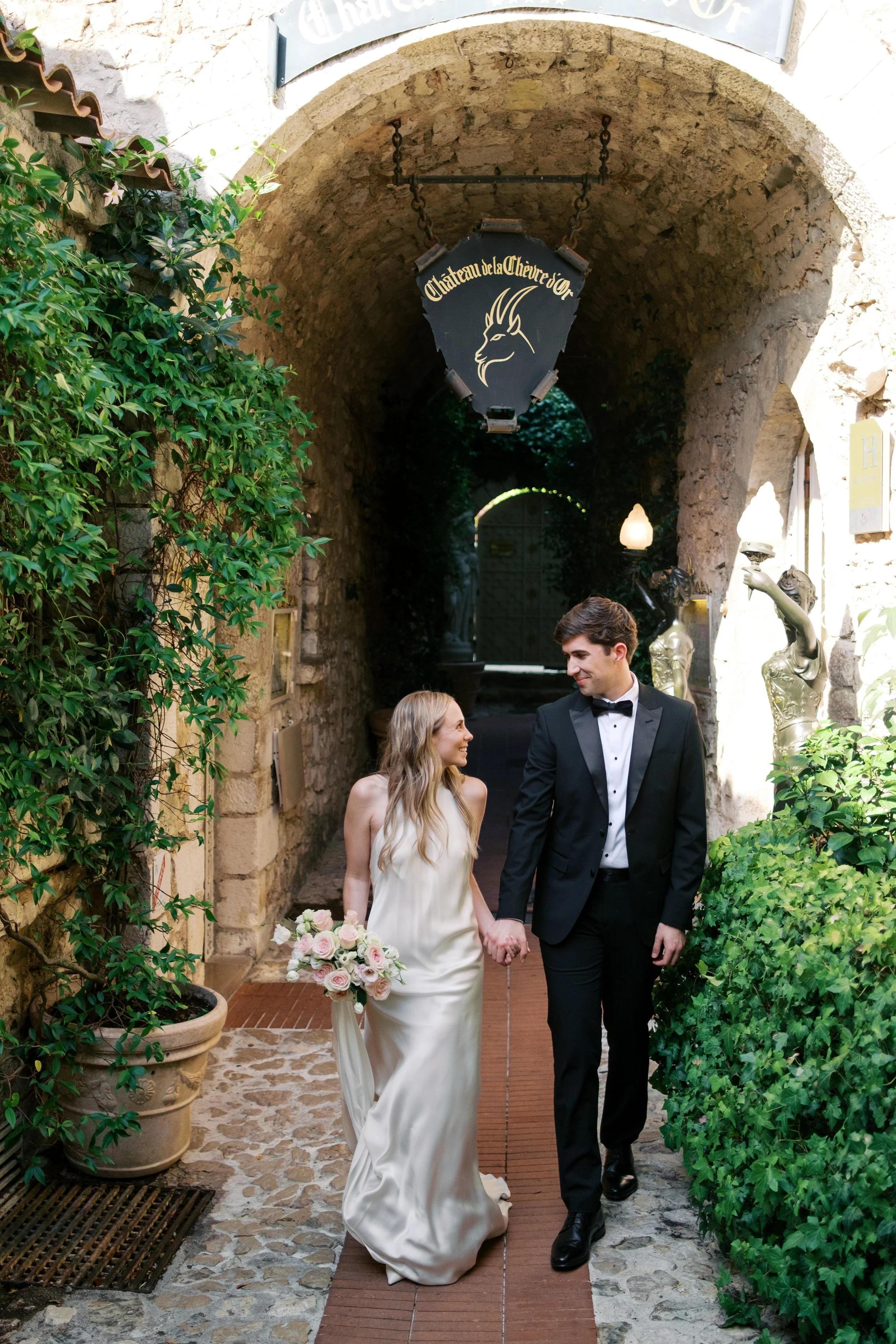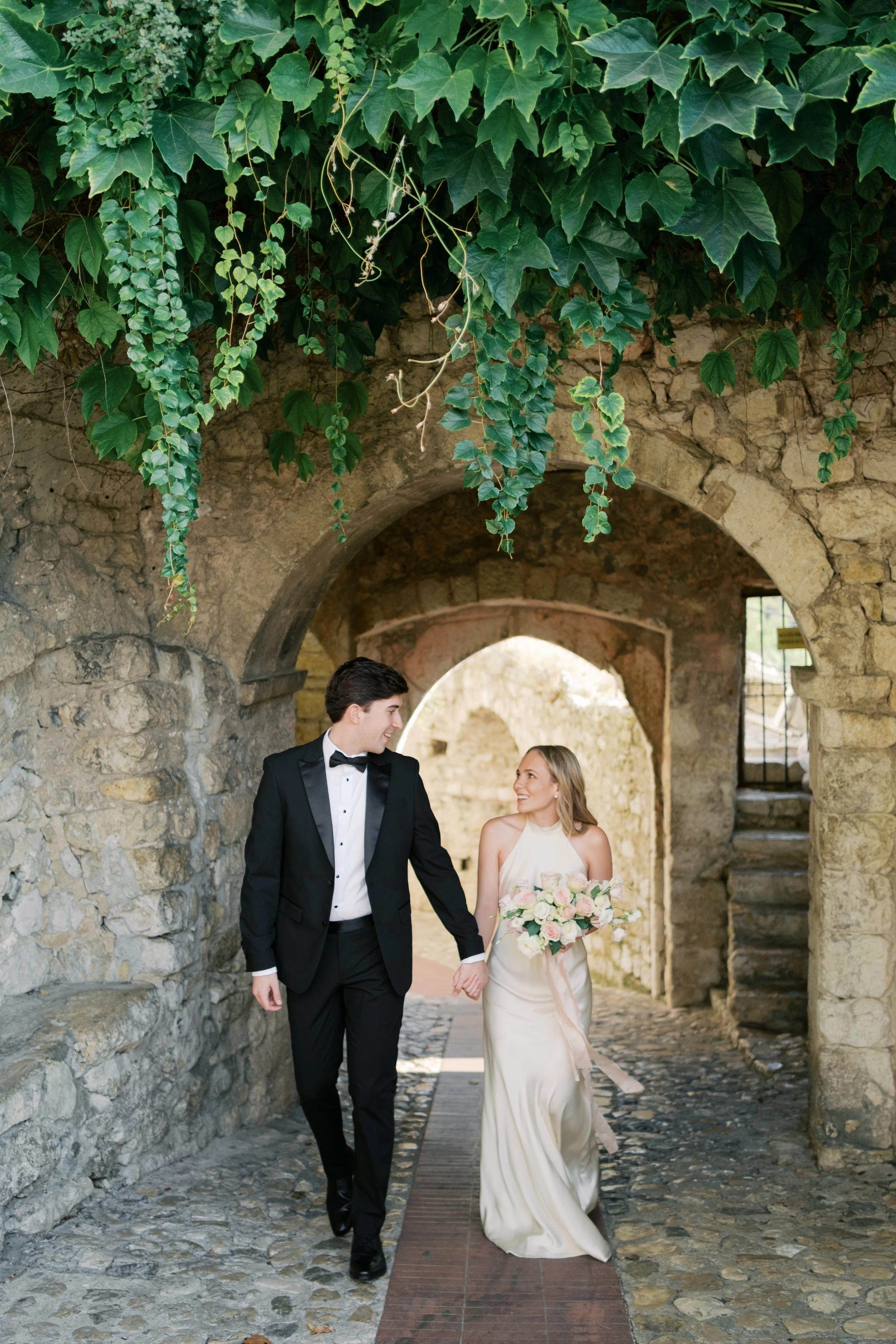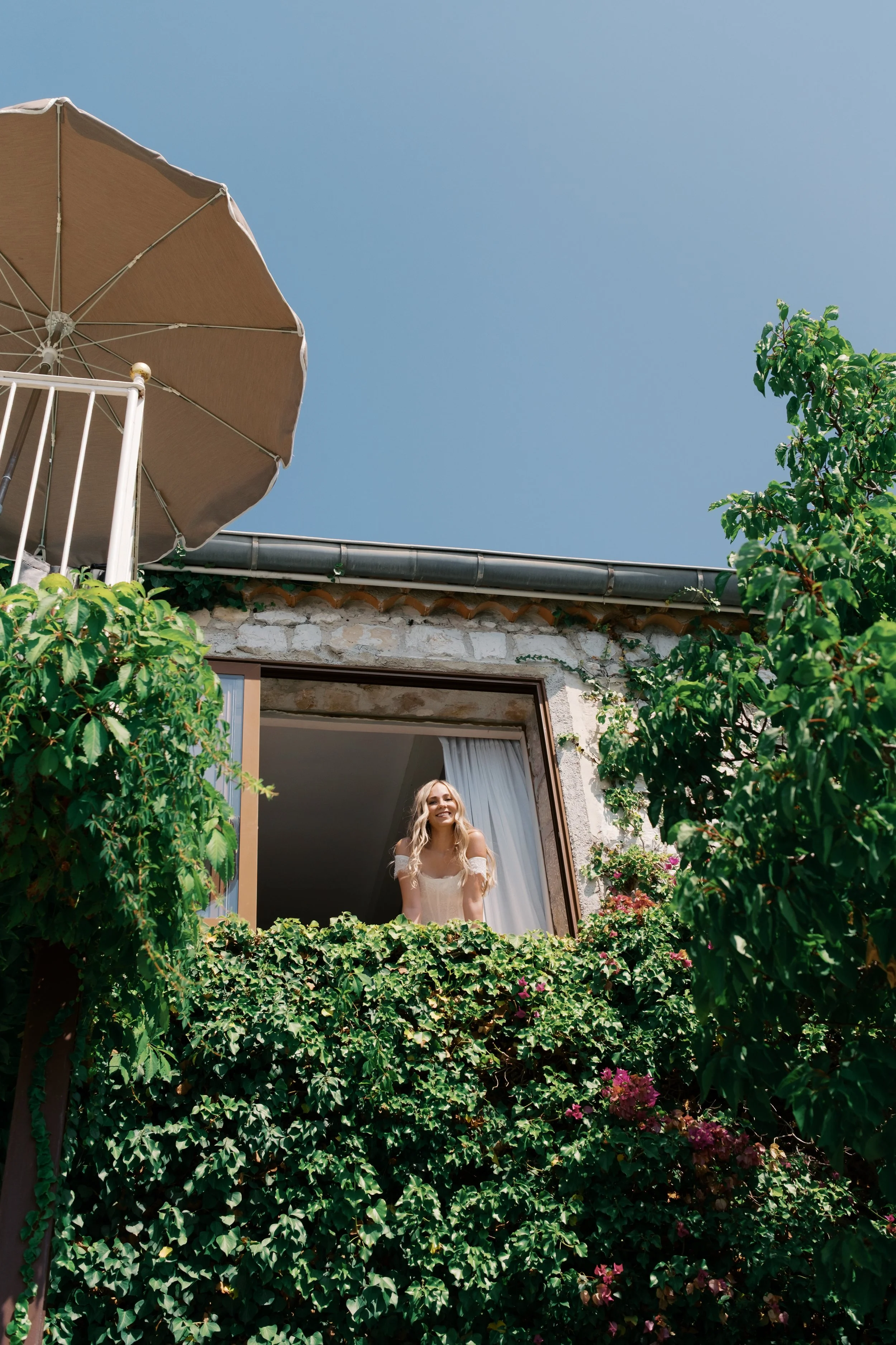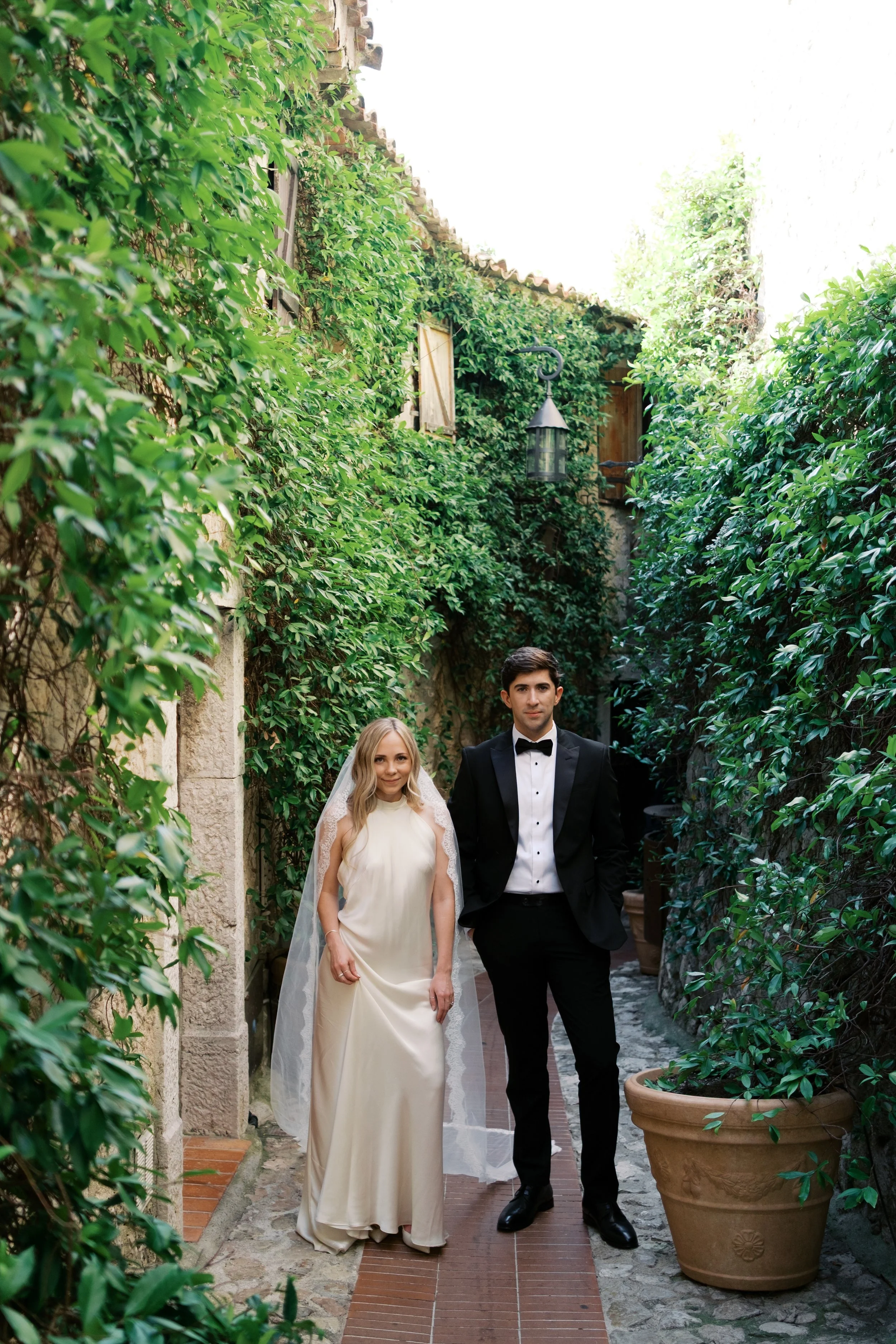 Despite starting well before sunrise, it’s probably no surprise that our wedding day wasn’t hard to wake up for. I got ready on our room’s deck with a view of the sunrise over the Mediterranean (which felt exactly how it sounds). The sun was sparkling over the water while I powdered eyeshadows and blushes to work on my own bridal glow. I was so relaxed that I ran a bit late for photos in the village! When we got back from the village, we captured these portraits in our pink, marble, bathroom while I did a round of touch ups on my face and hair. We laughed off my hair’s unwillingness to hold a curl regardless of the can of hair spray I ran through that morning. It gave us a chance to embrace the French c'est la vie, and roll out with a carefree version of bridal hair.