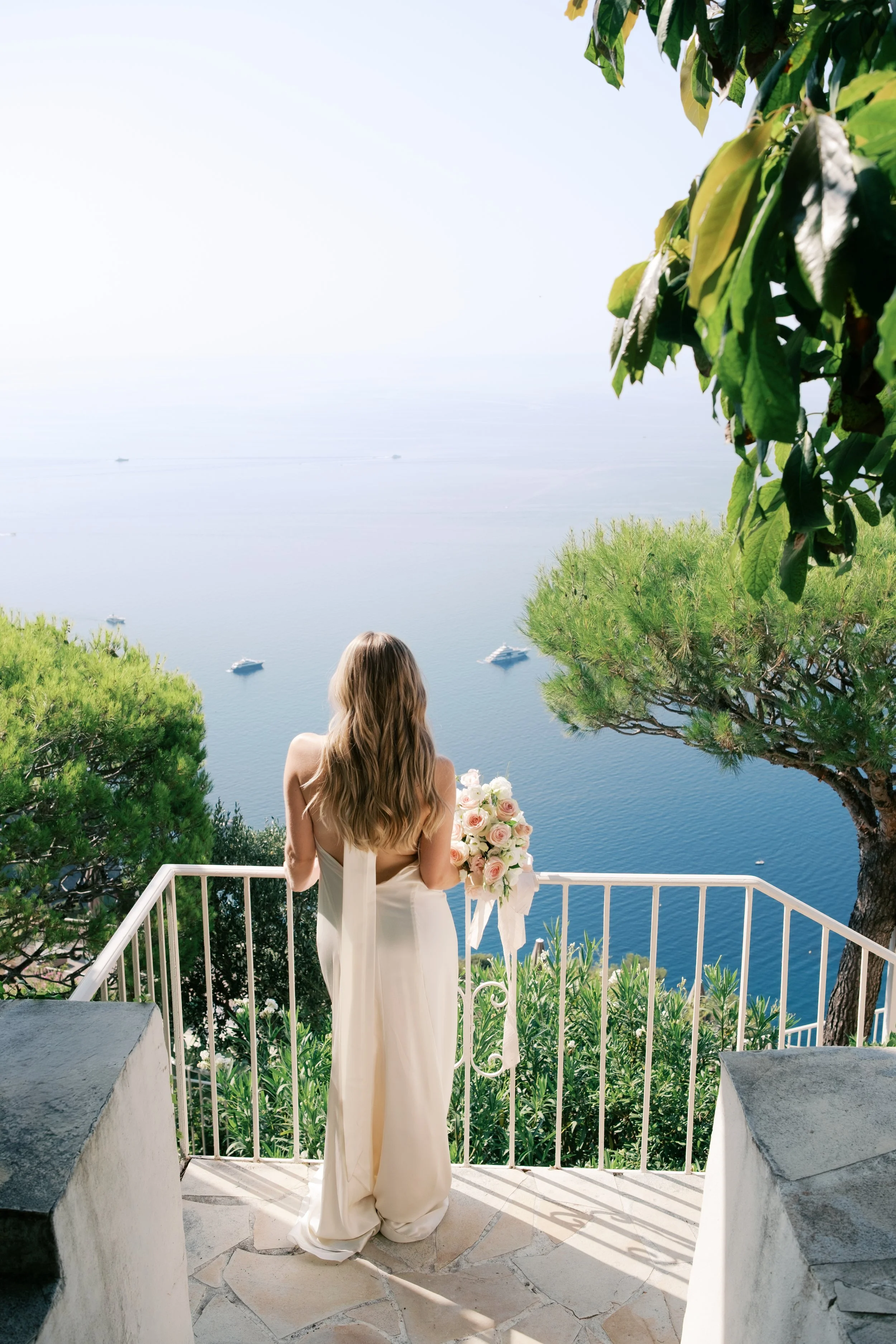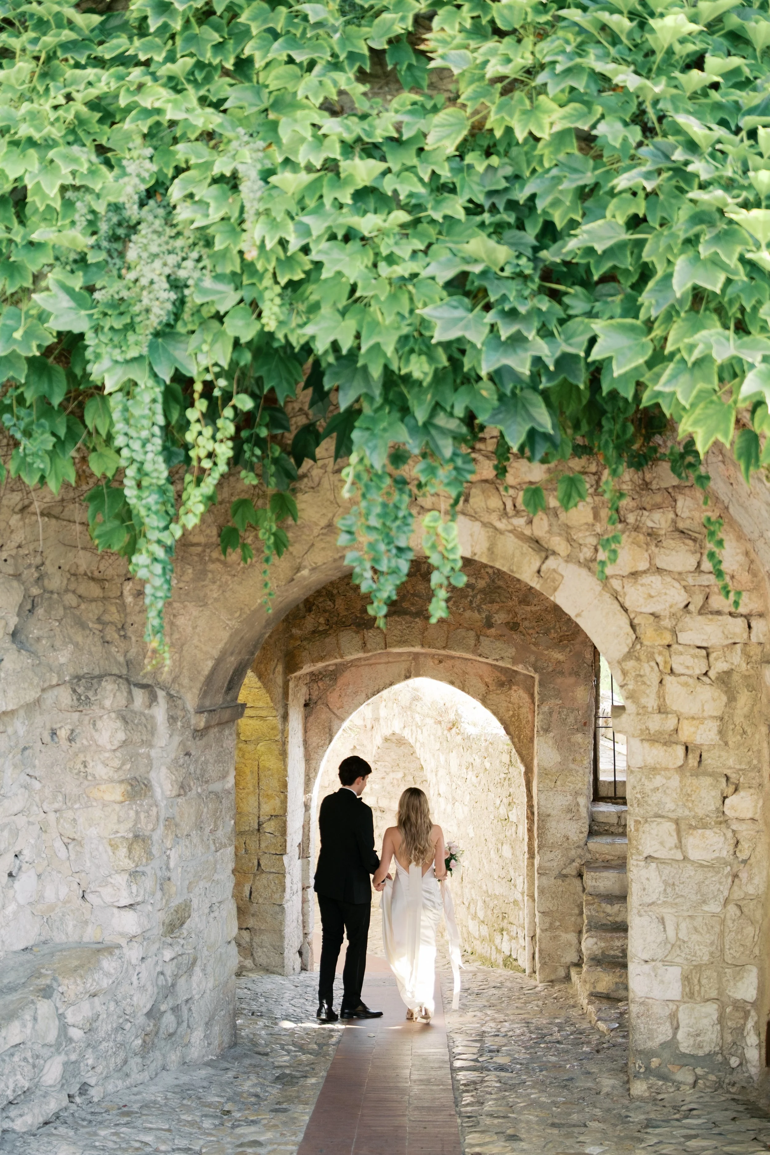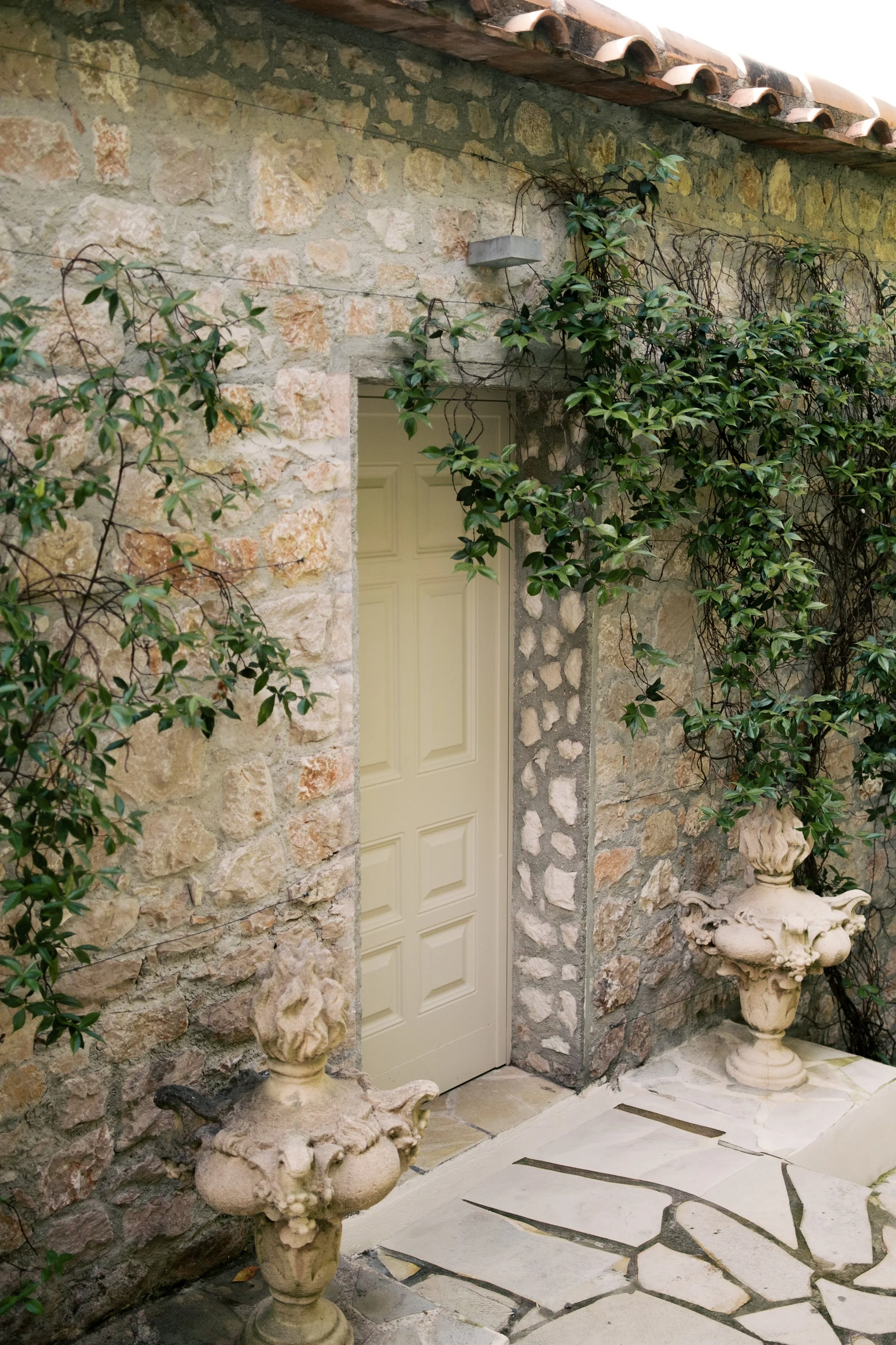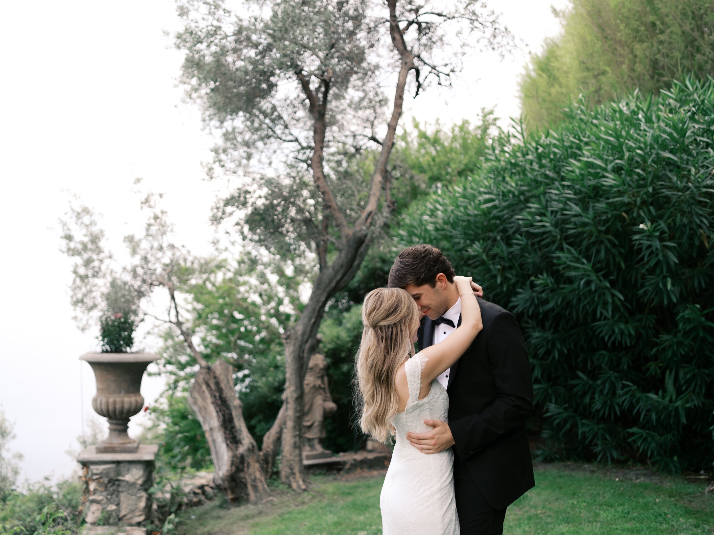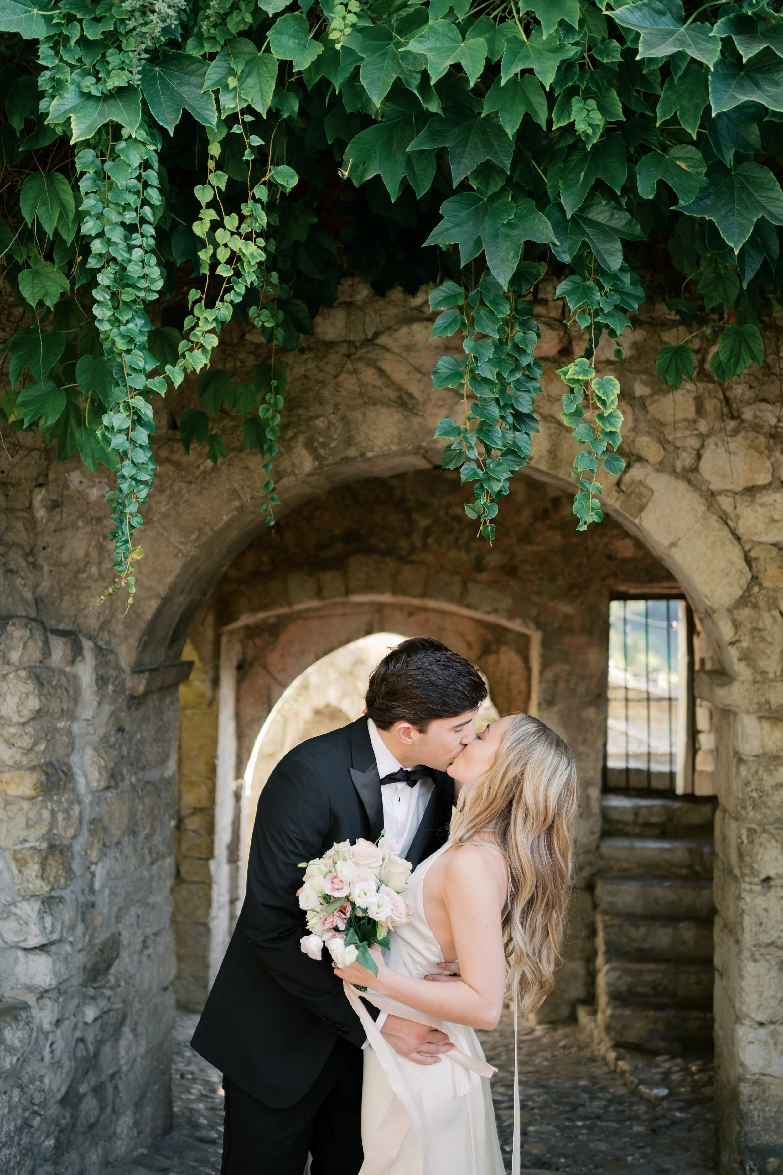 Despite starting well before sunrise, it’s probably no surprise that our wedding day wasn’t hard to wake up for. I got ready on our room’s deck with a view of the sunrise over the Mediterranean (which felt exactly how it sounds). The sun was sparkling over the water while I powdered eyeshadows and blushes to work on my own bridal glow. I was so relaxed that I ran a bit late for photos in the village! When we got back from the village, we captured these portraits in our pink, marble, bathroom while I did a round of touch ups on my face and hair. We laughed off my hair’s unwillingness to hold a curl regardless of the can of hair spray I ran through that morning. It gave us a chance to embrace the French c'est la vie, and roll out with a carefree version of bridal hair.
