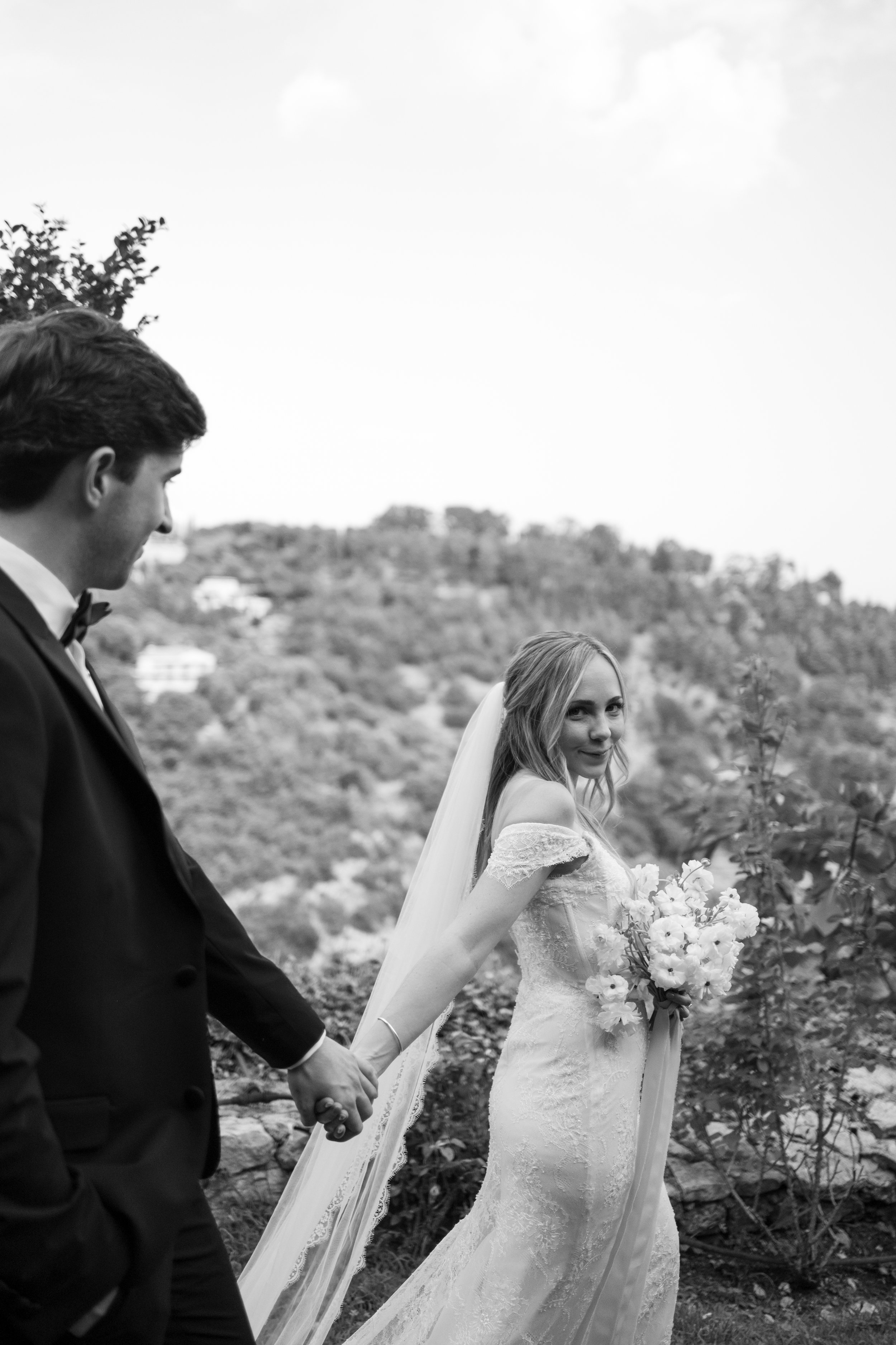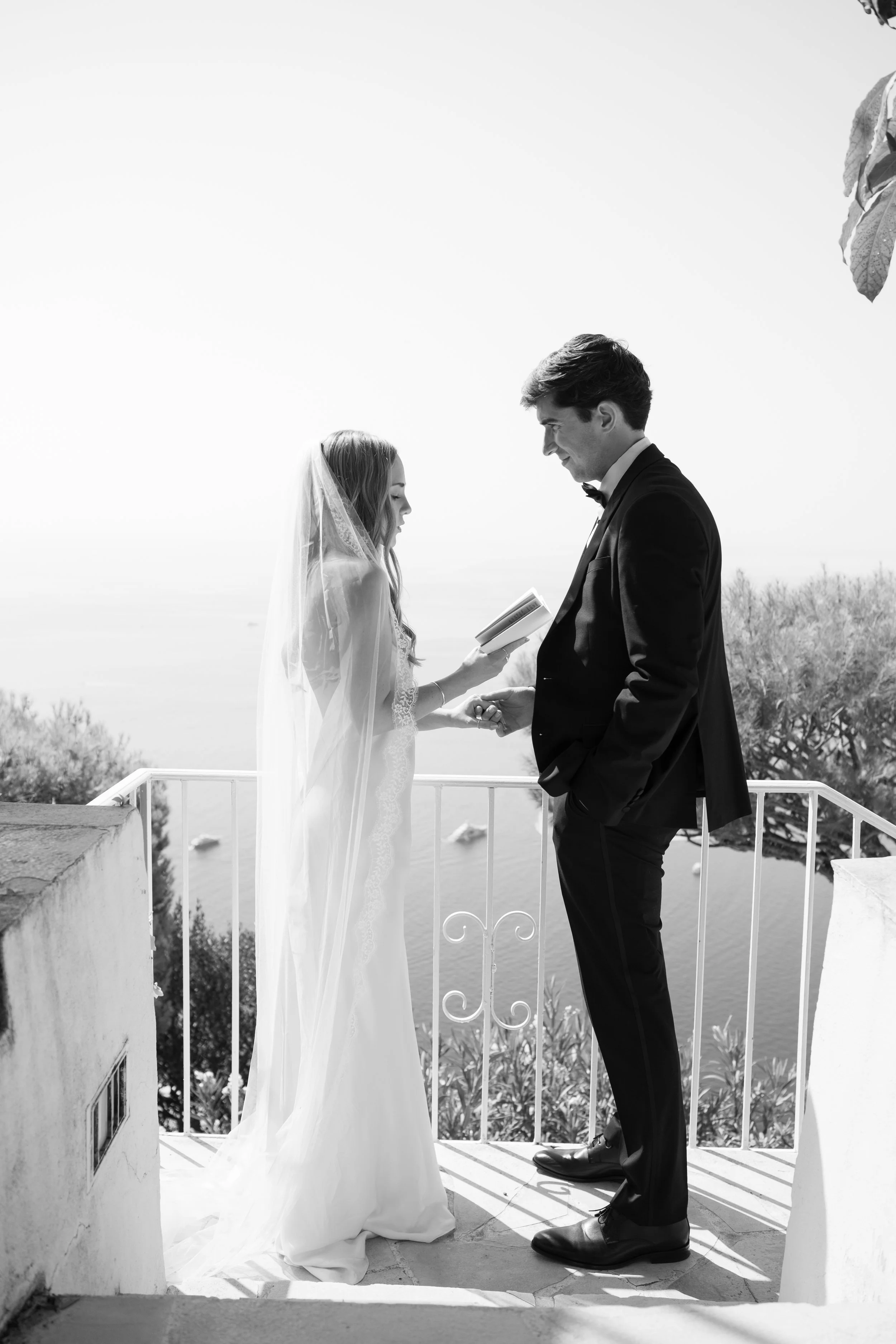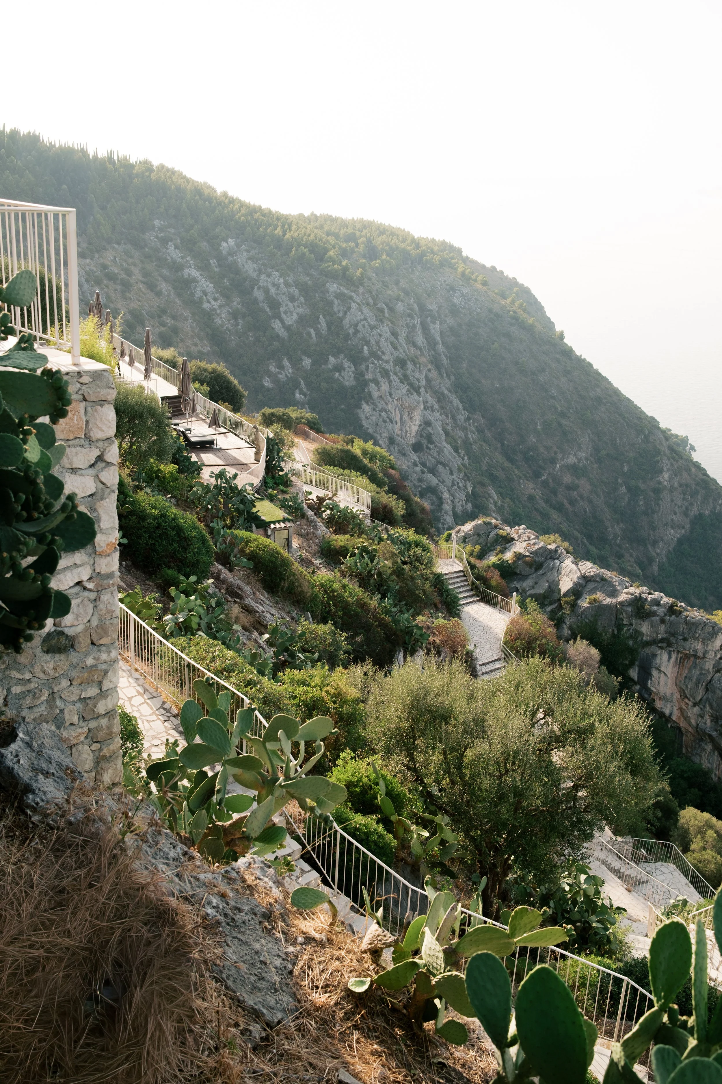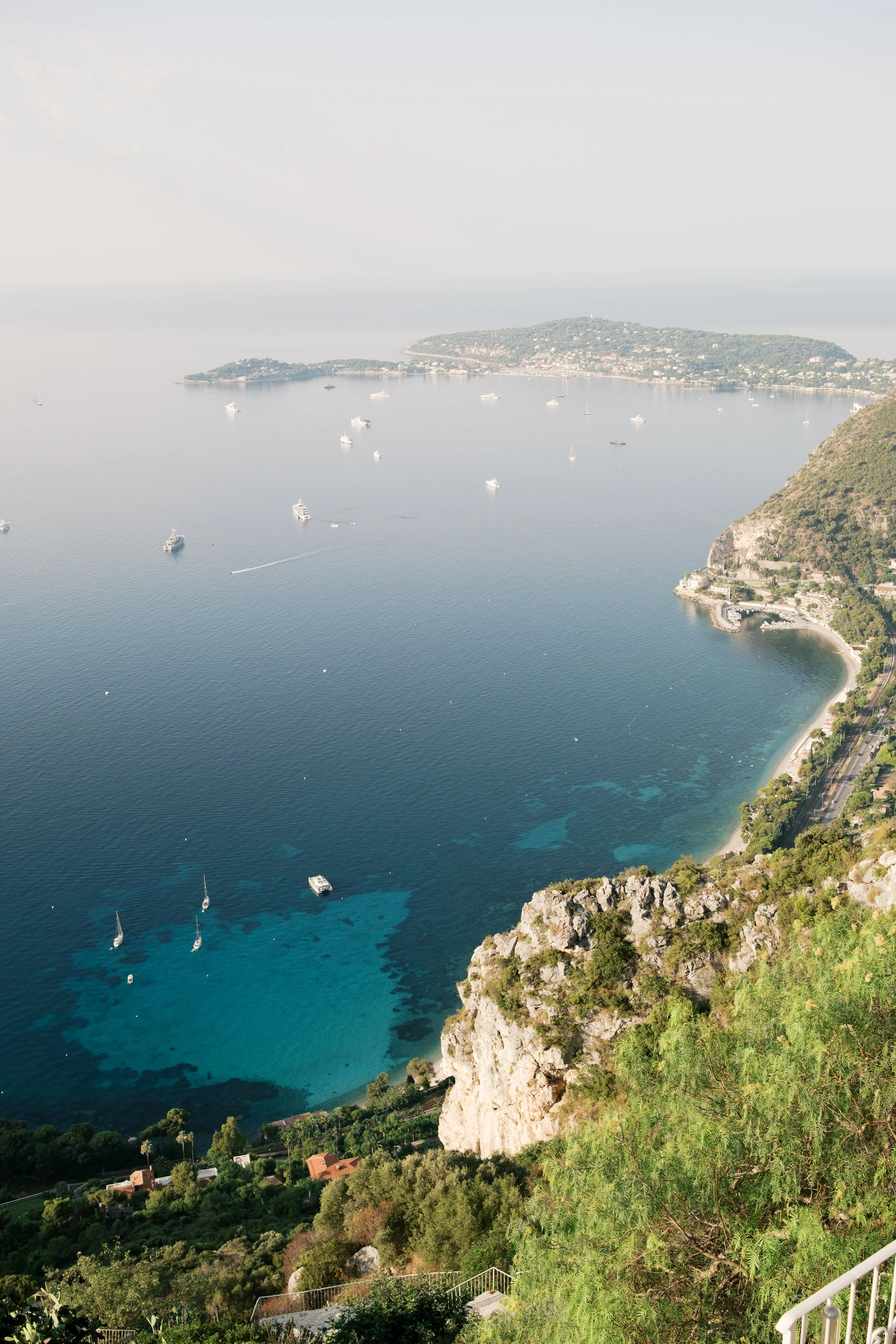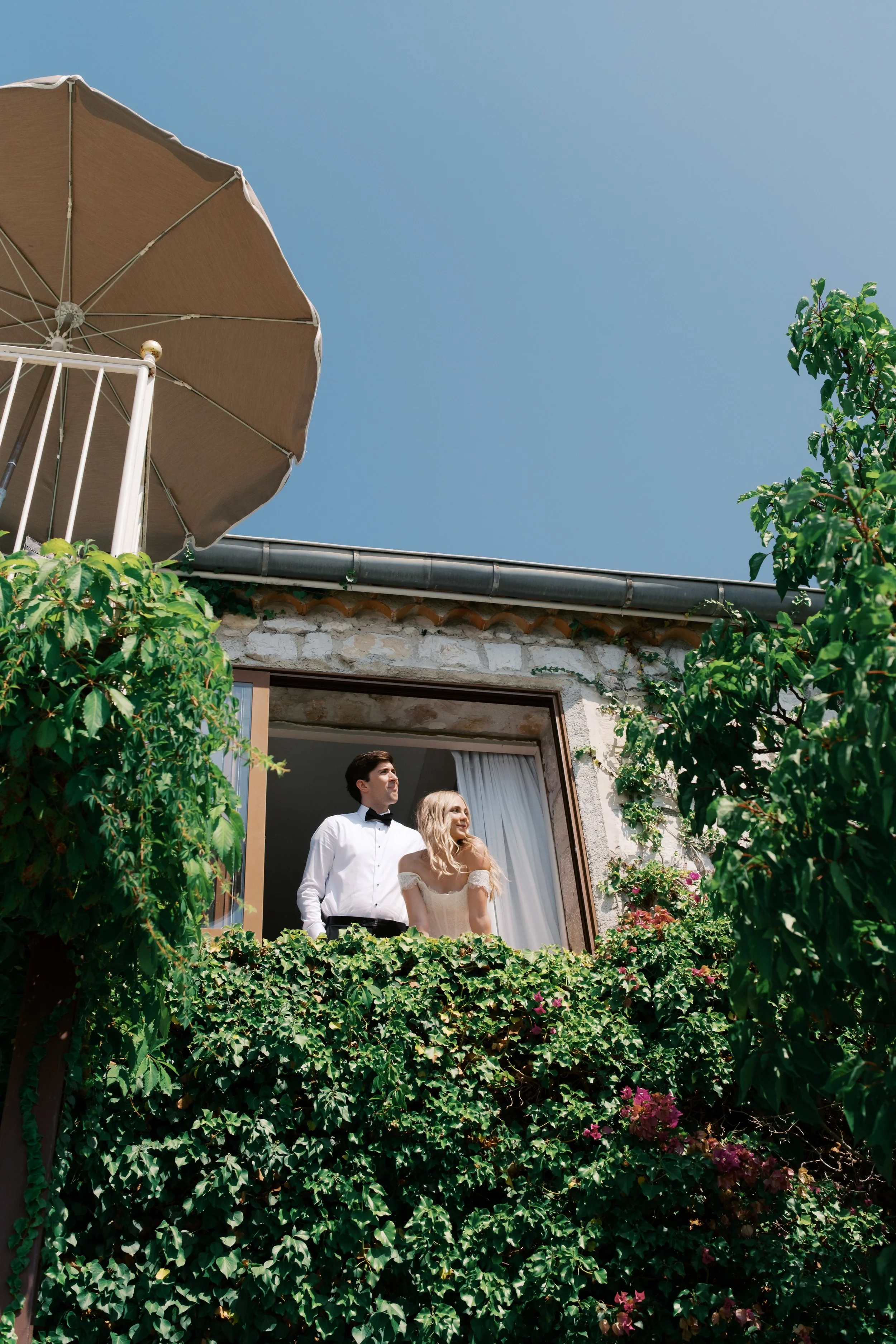Despite starting well before sunrise, it’s probably no surprise that our wedding day wasn’t hard to wake up for. I got ready on our room’s deck with a view of the sunrise over the Mediterranean (which felt exactly how it sounds). The sun was sparkling over the water while I powdered eyeshadows and blushes to work on my own bridal glow. I was so relaxed that I ran a bit late for photos in the village! When we got back from the village, we captured these portraits in our pink, marble, bathroom while I did a round of touch ups on my face and hair. We laughed off my hair’s unwillingness to hold a curl regardless of the can of hair spray I ran through that morning. It gave us a chance to embrace the French c'est la vie, and roll out with a carefree version of bridal hair.