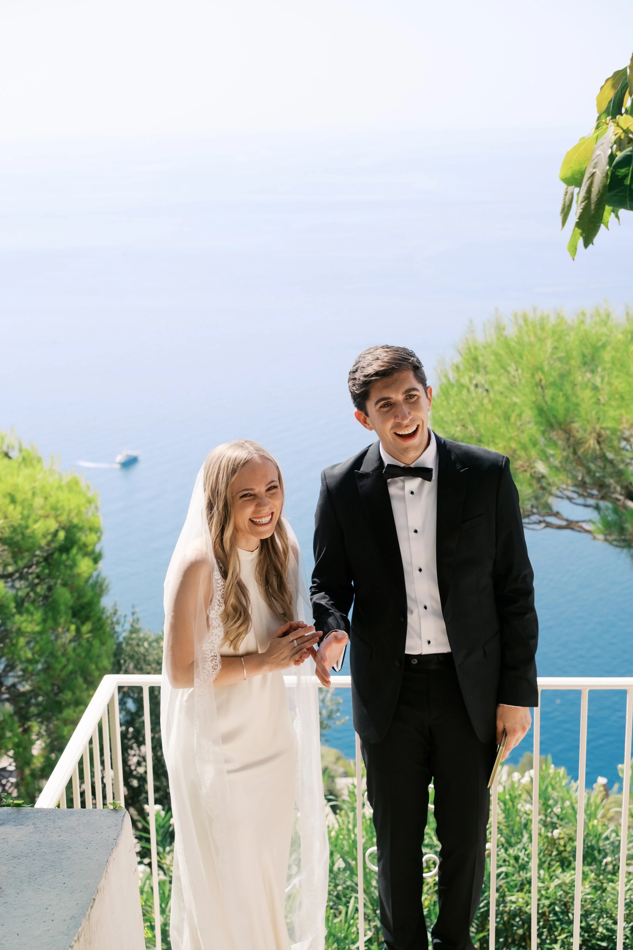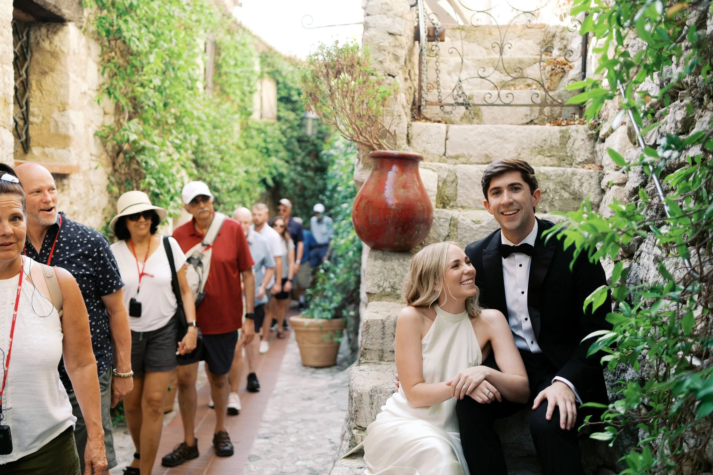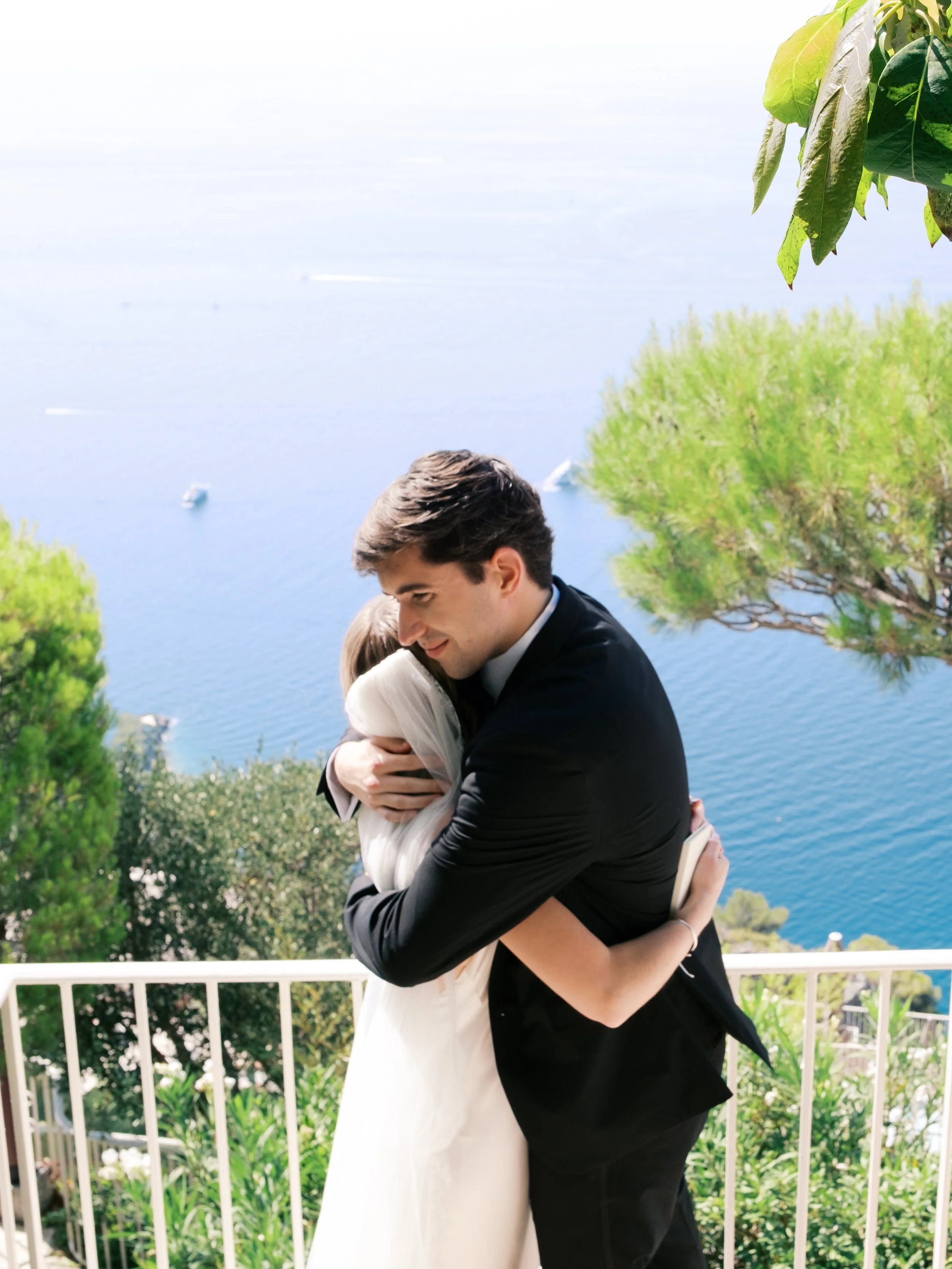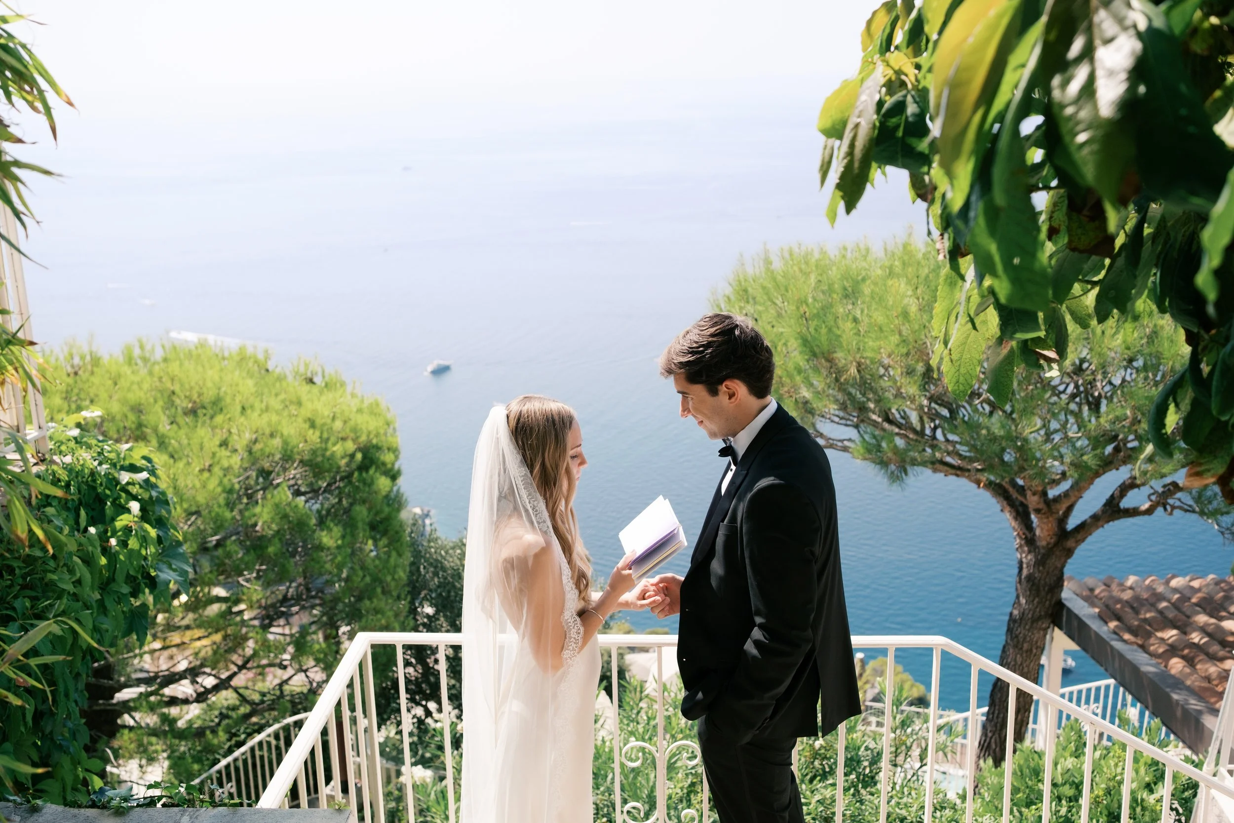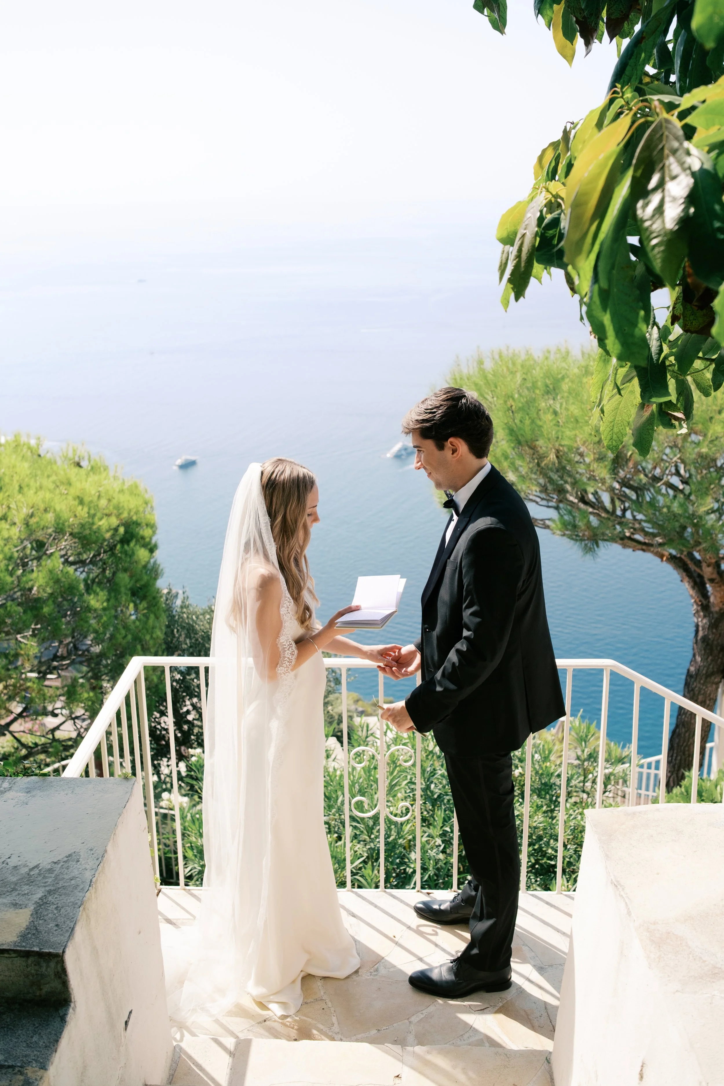 Despite starting well before sunrise, it’s probably no surprise that our wedding day wasn’t hard to wake up for. I got ready on our room’s deck with a view of the sunrise over the Mediterranean (which felt exactly how it sounds). The sun was sparkling over the water while I powdered eyeshadows and blushes to work on my own bridal glow. I was so relaxed that I ran a bit late for photos in the village! When we got back from the village, we captured these portraits in our pink, marble, bathroom while I did a round of touch ups on my face and hair. We laughed off my hair’s unwillingness to hold a curl regardless of the can of hair spray I ran through that morning. It gave us a chance to embrace the French c'est la vie, and roll out with a carefree version of bridal hair.
