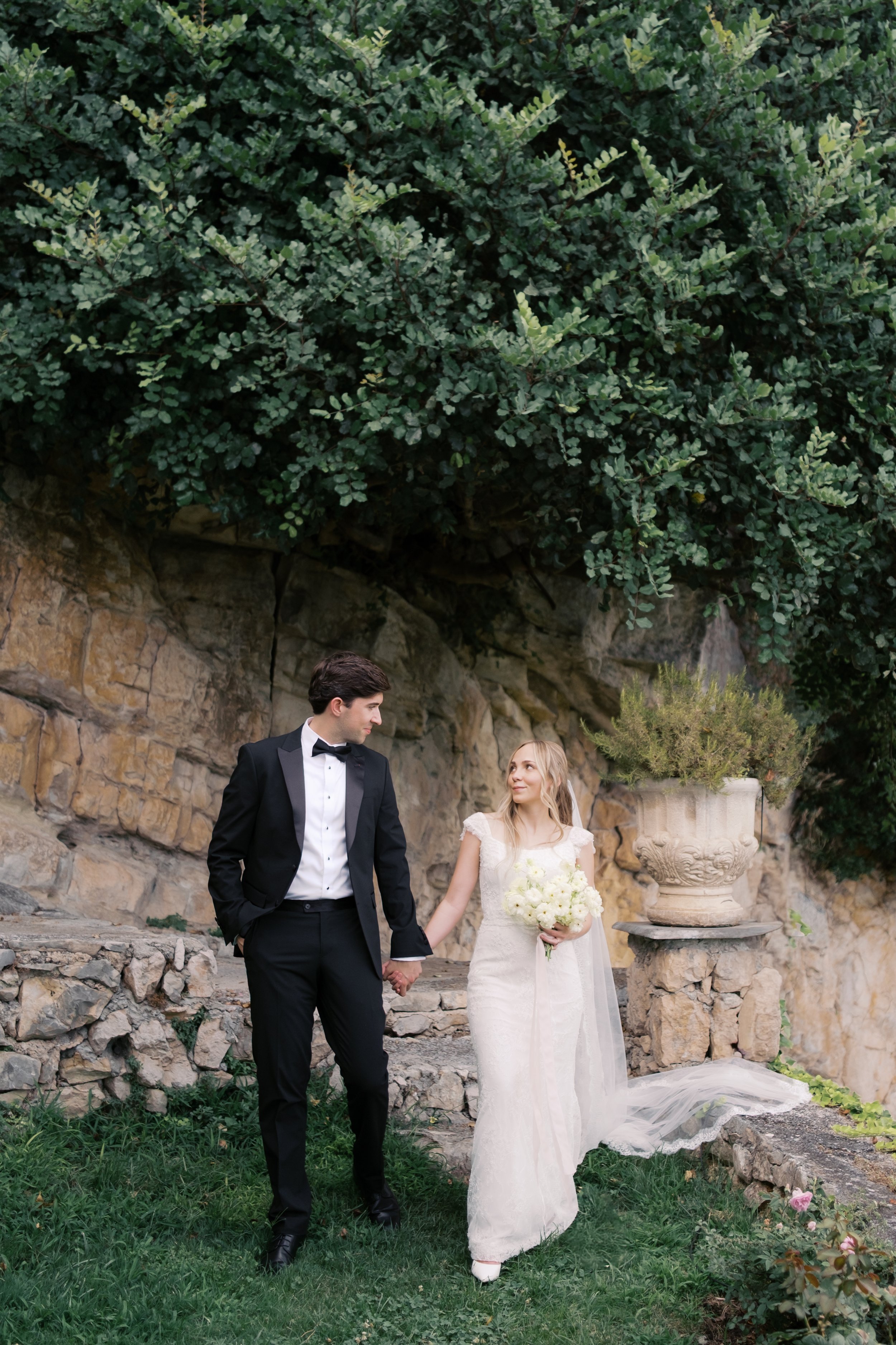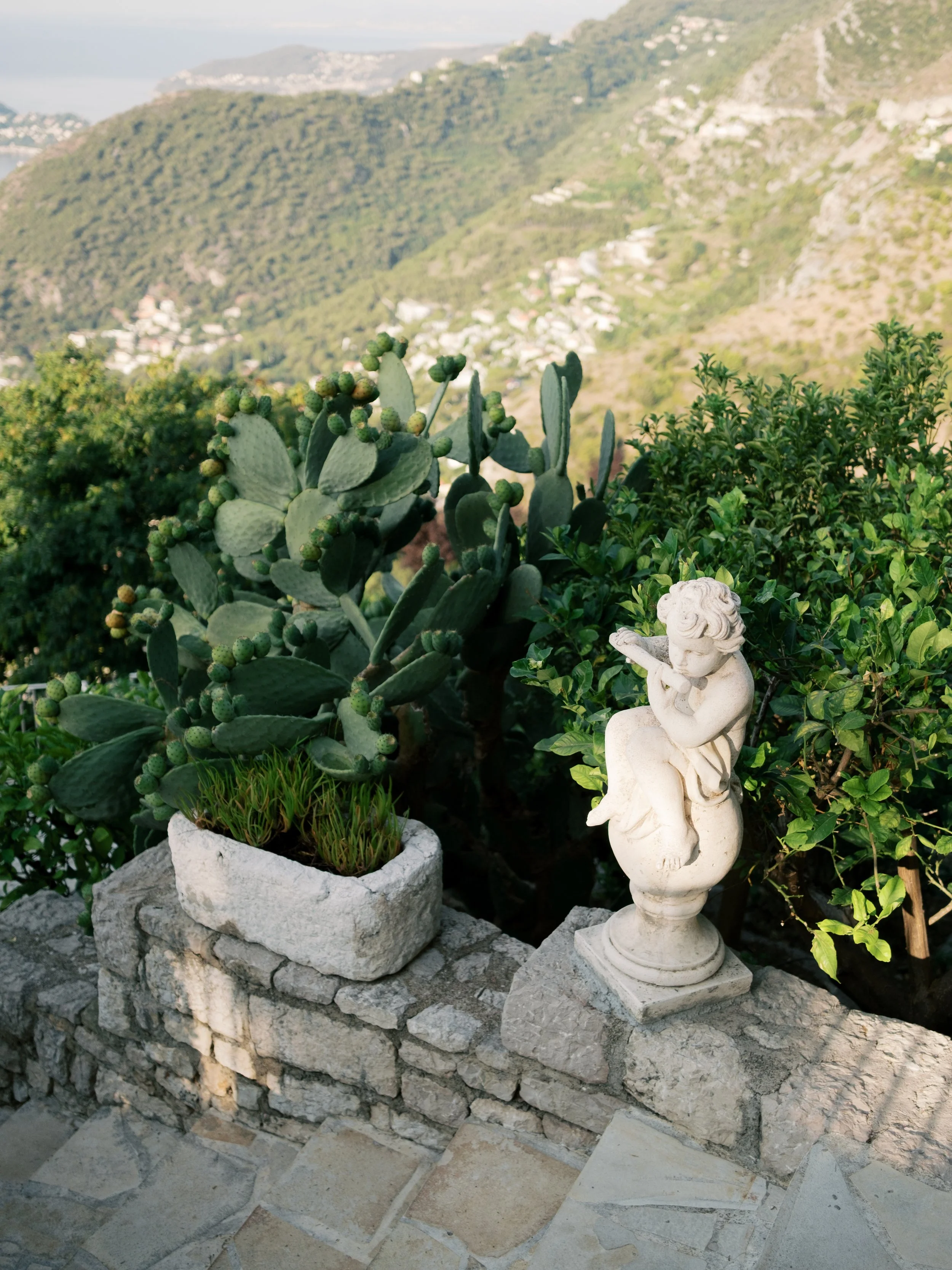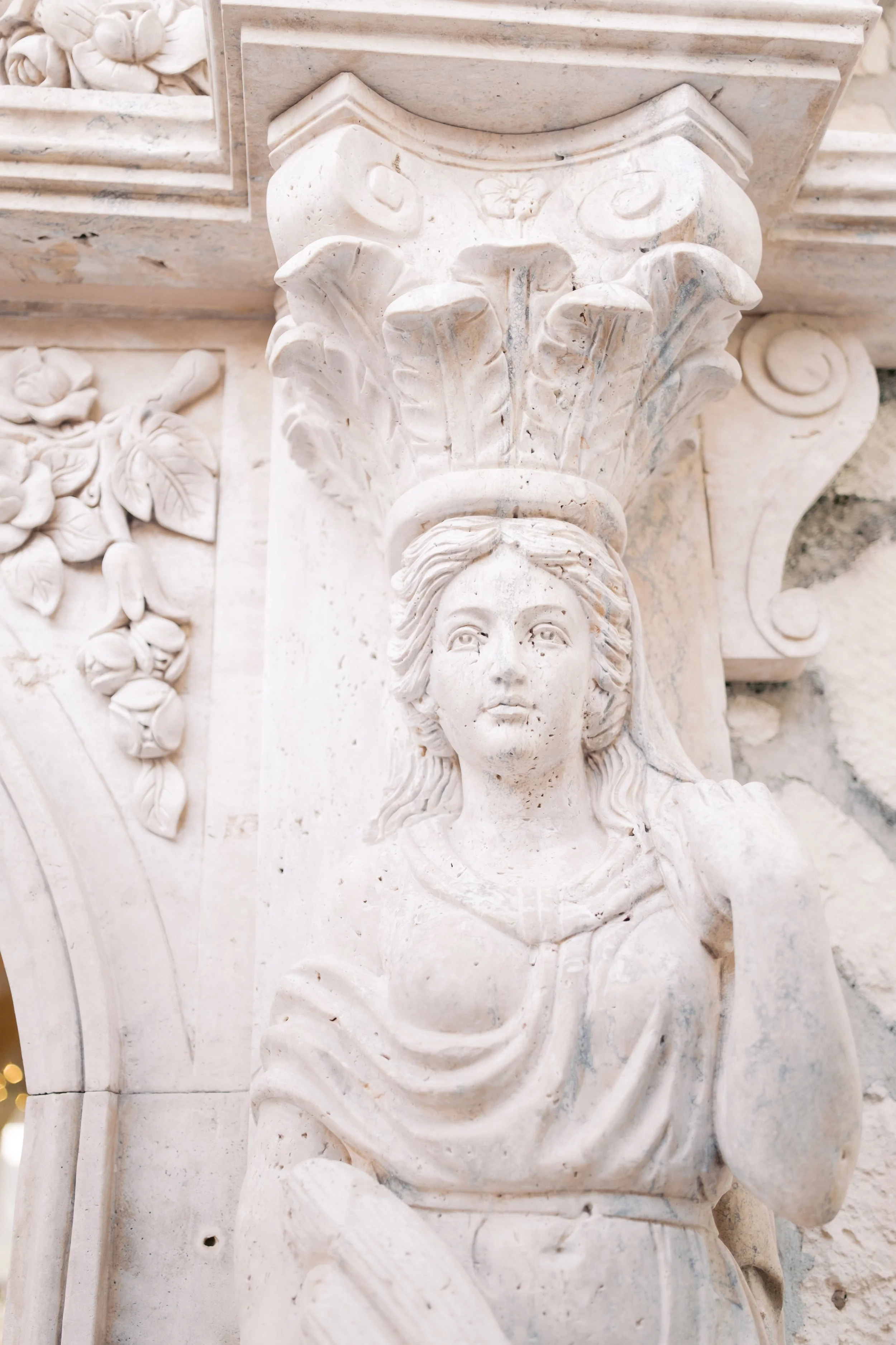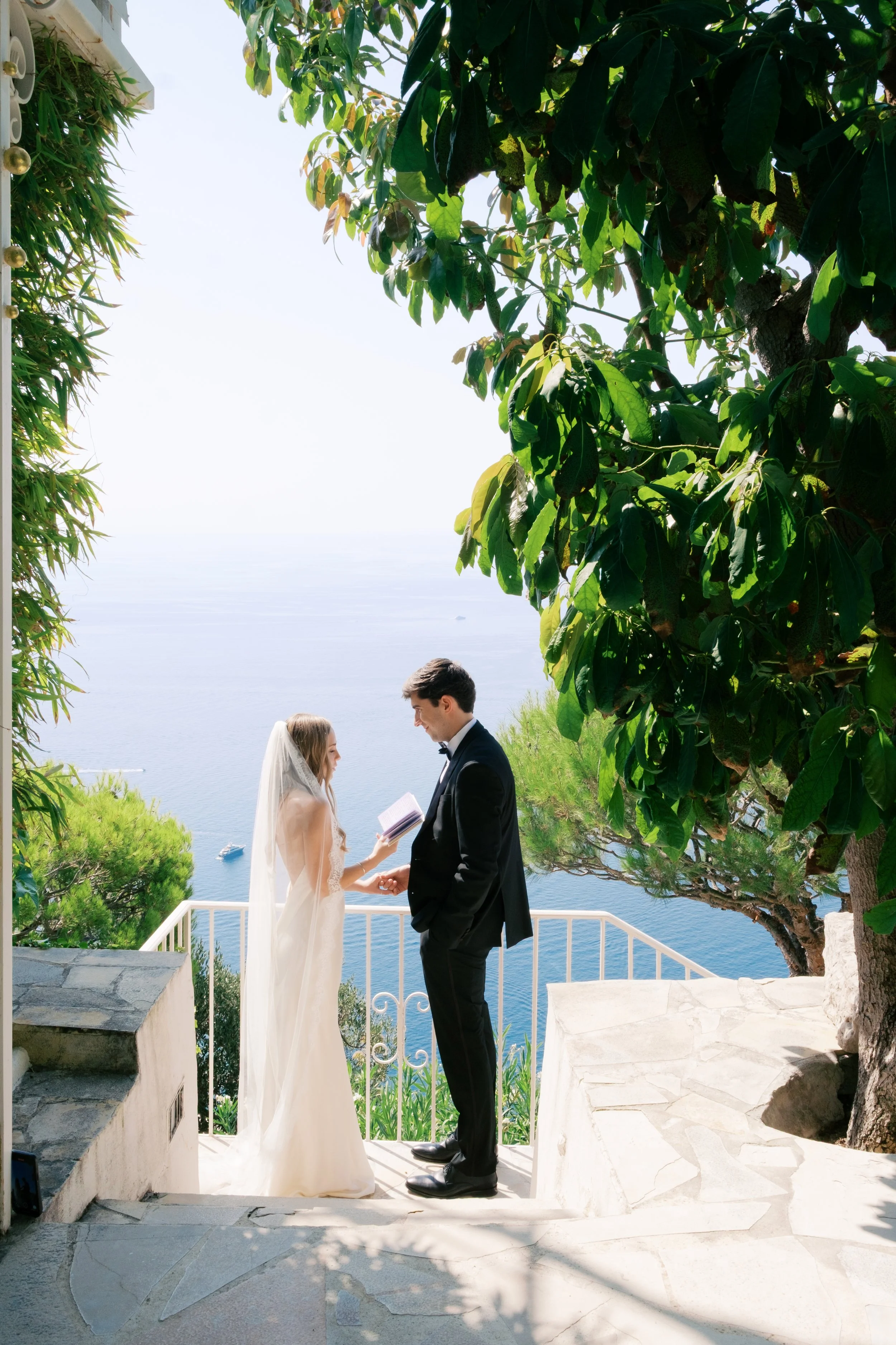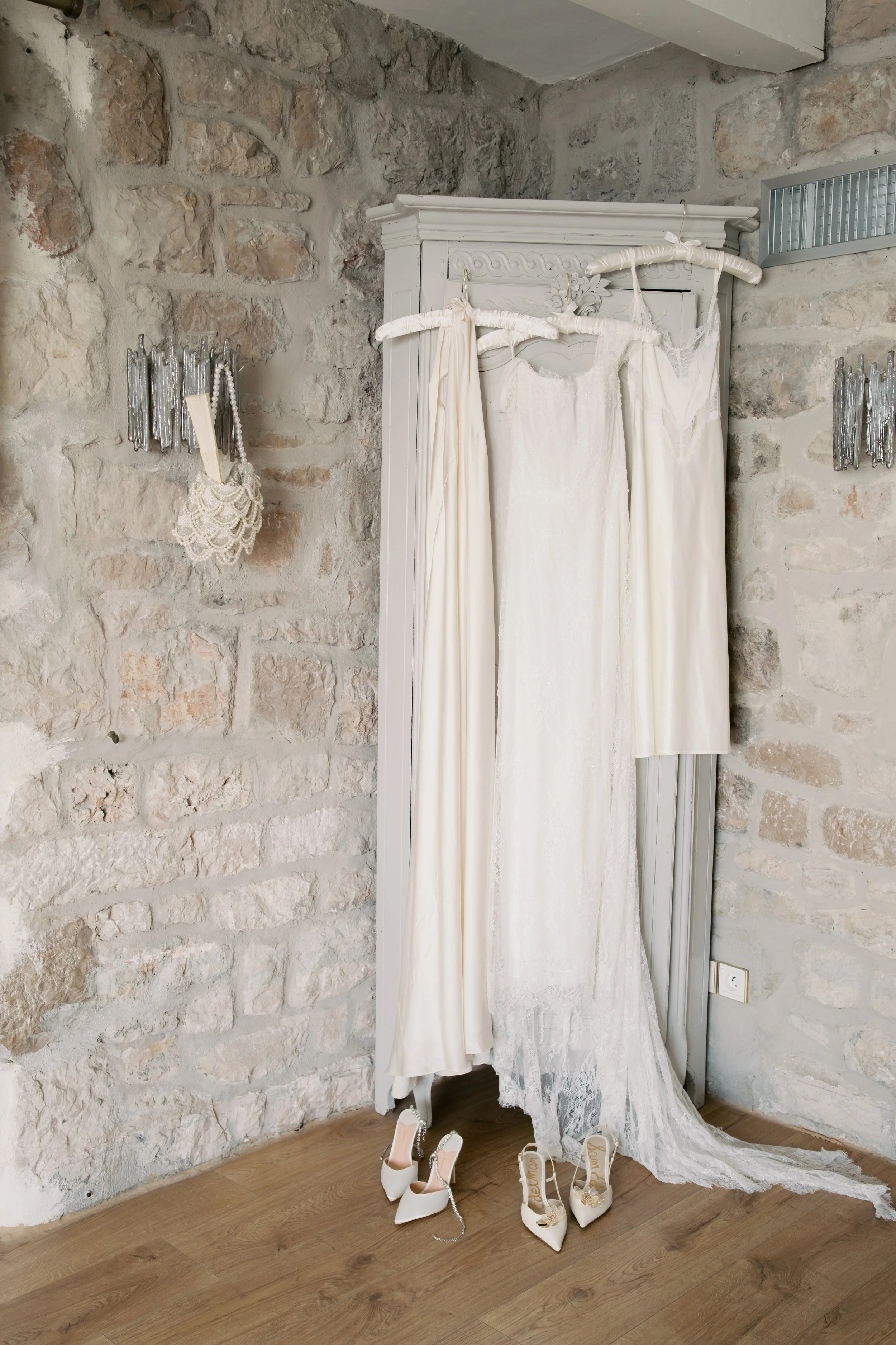 Despite starting well before sunrise, it’s probably no surprise that our wedding day wasn’t hard to wake up for. I got ready on our room’s deck with a view of the sunrise over the Mediterranean (which felt exactly how it sounds). The sun was sparkling over the water while I powdered eyeshadows and blushes to work on my own bridal glow. I was so relaxed that I ran a bit late for photos in the village! When we got back from the village, we captured these portraits in our pink, marble, bathroom while I did a round of touch ups on my face and hair. We laughed off my hair’s unwillingness to hold a curl regardless of the can of hair spray I ran through that morning. It gave us a chance to embrace the French c'est la vie, and roll out with a carefree version of bridal hair.