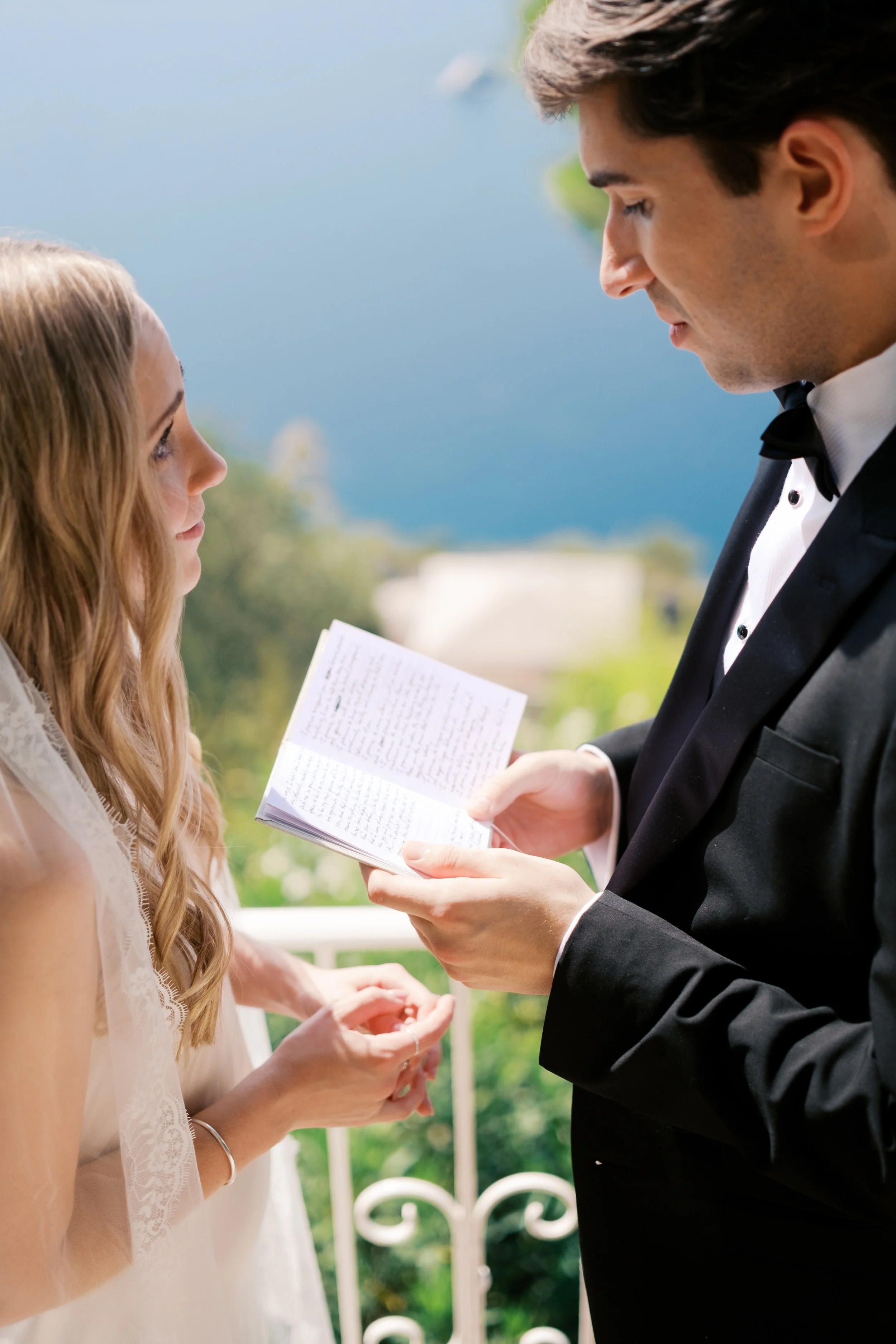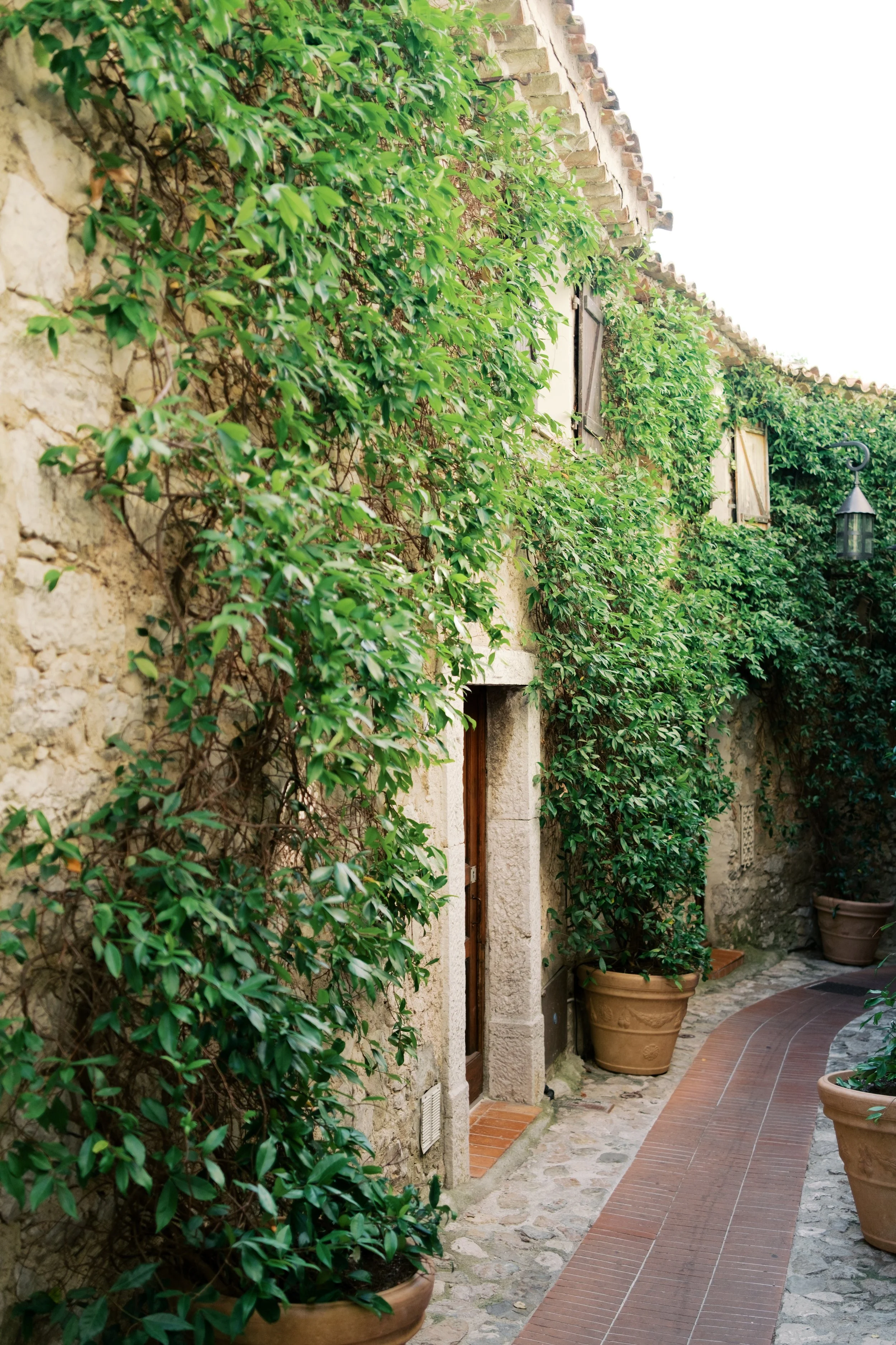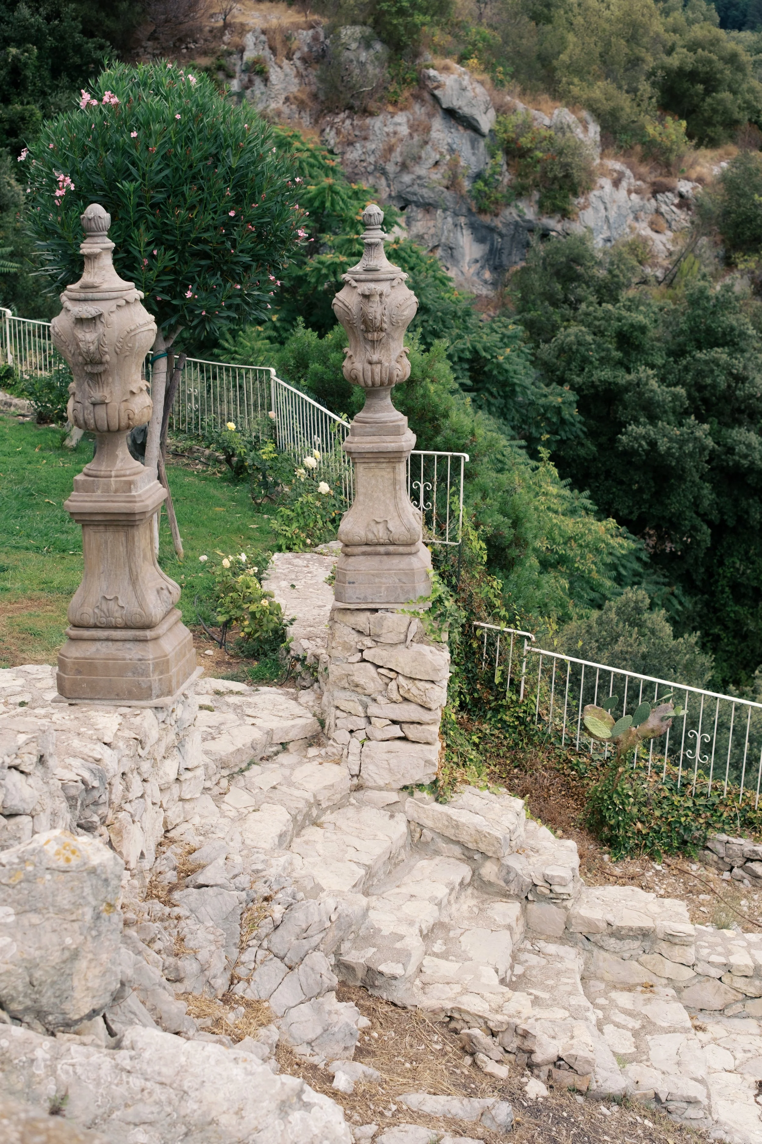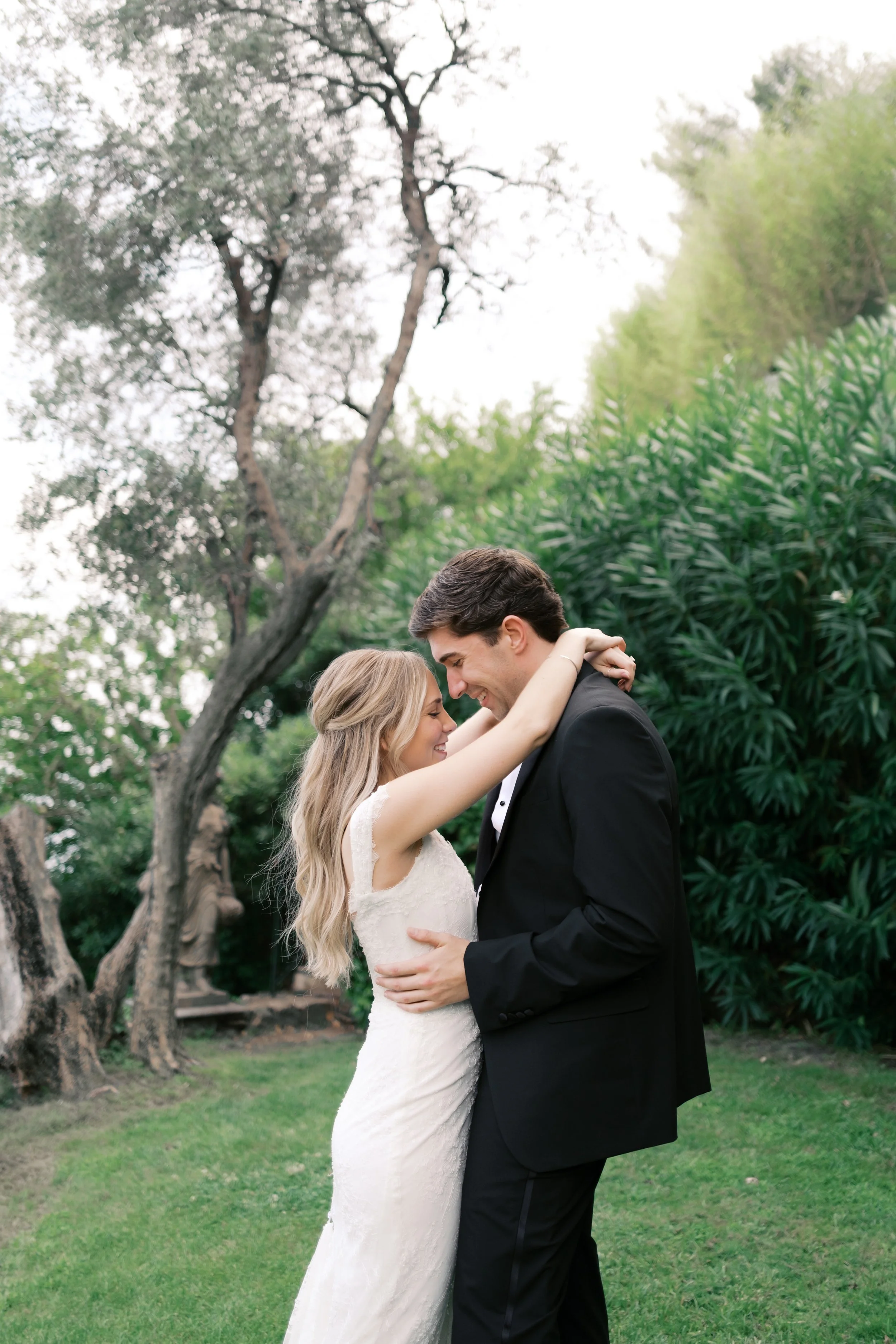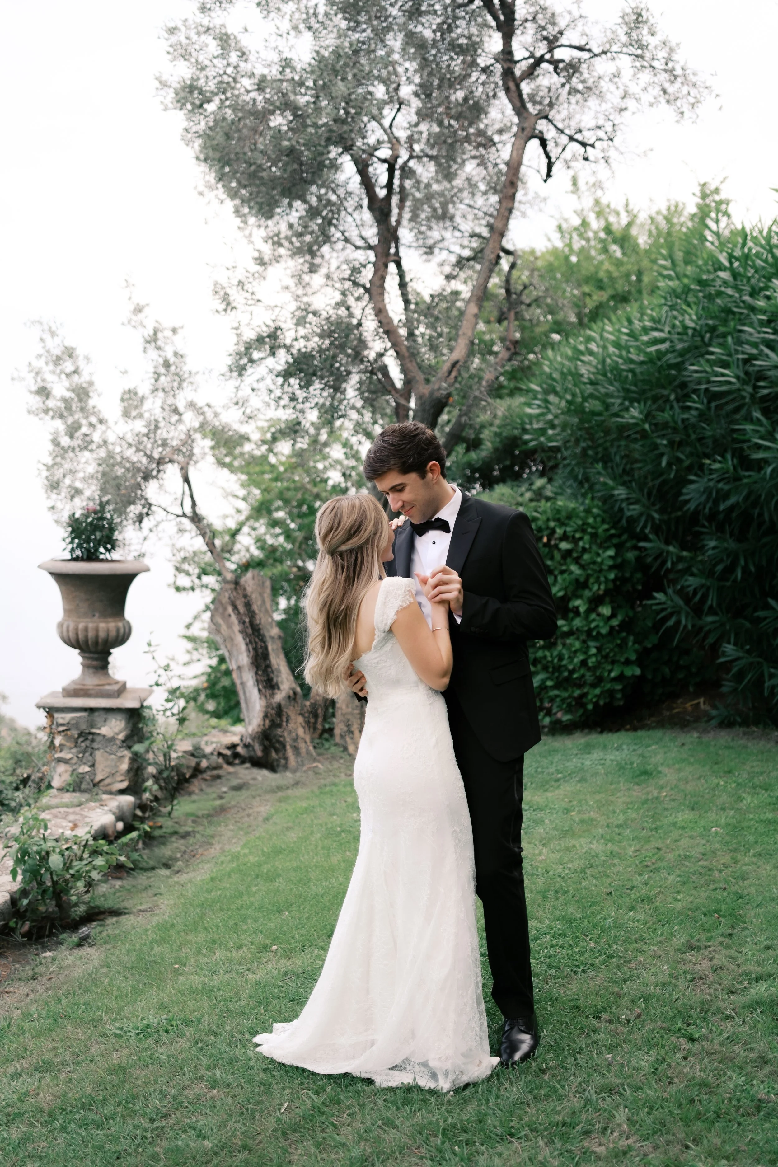 Despite starting well before sunrise, it’s probably no surprise that our wedding day wasn’t hard to wake up for. I got ready on our room’s deck with a view of the sunrise over the Mediterranean (which felt exactly how it sounds). The sun was sparkling over the water while I powdered eyeshadows and blushes to work on my own bridal glow. I was so relaxed that I ran a bit late for photos in the village! When we got back from the village, we captured these portraits in our pink, marble, bathroom while I did a round of touch ups on my face and hair. We laughed off my hair’s unwillingness to hold a curl regardless of the can of hair spray I ran through that morning. It gave us a chance to embrace the French c'est la vie, and roll out with a carefree version of bridal hair.