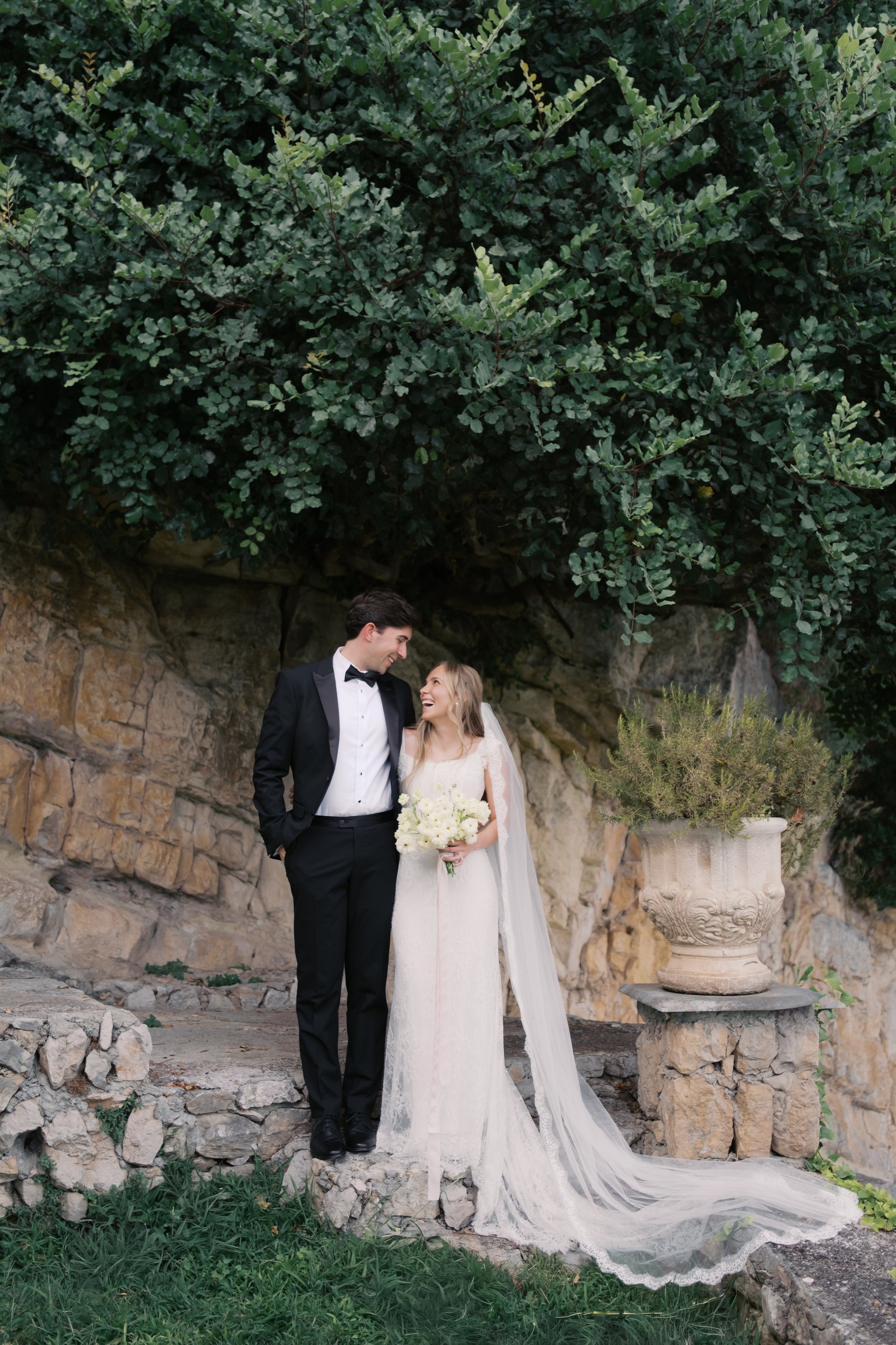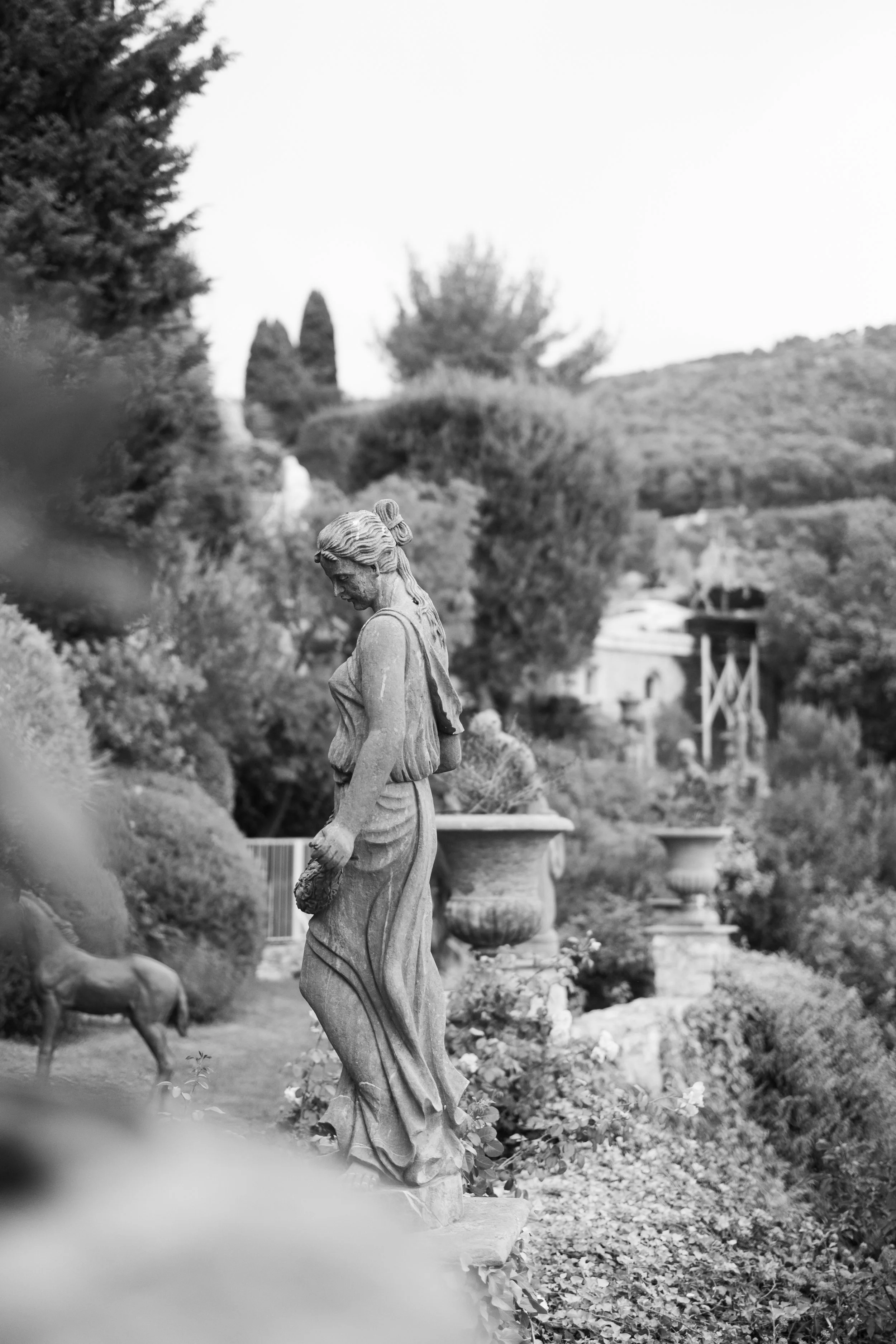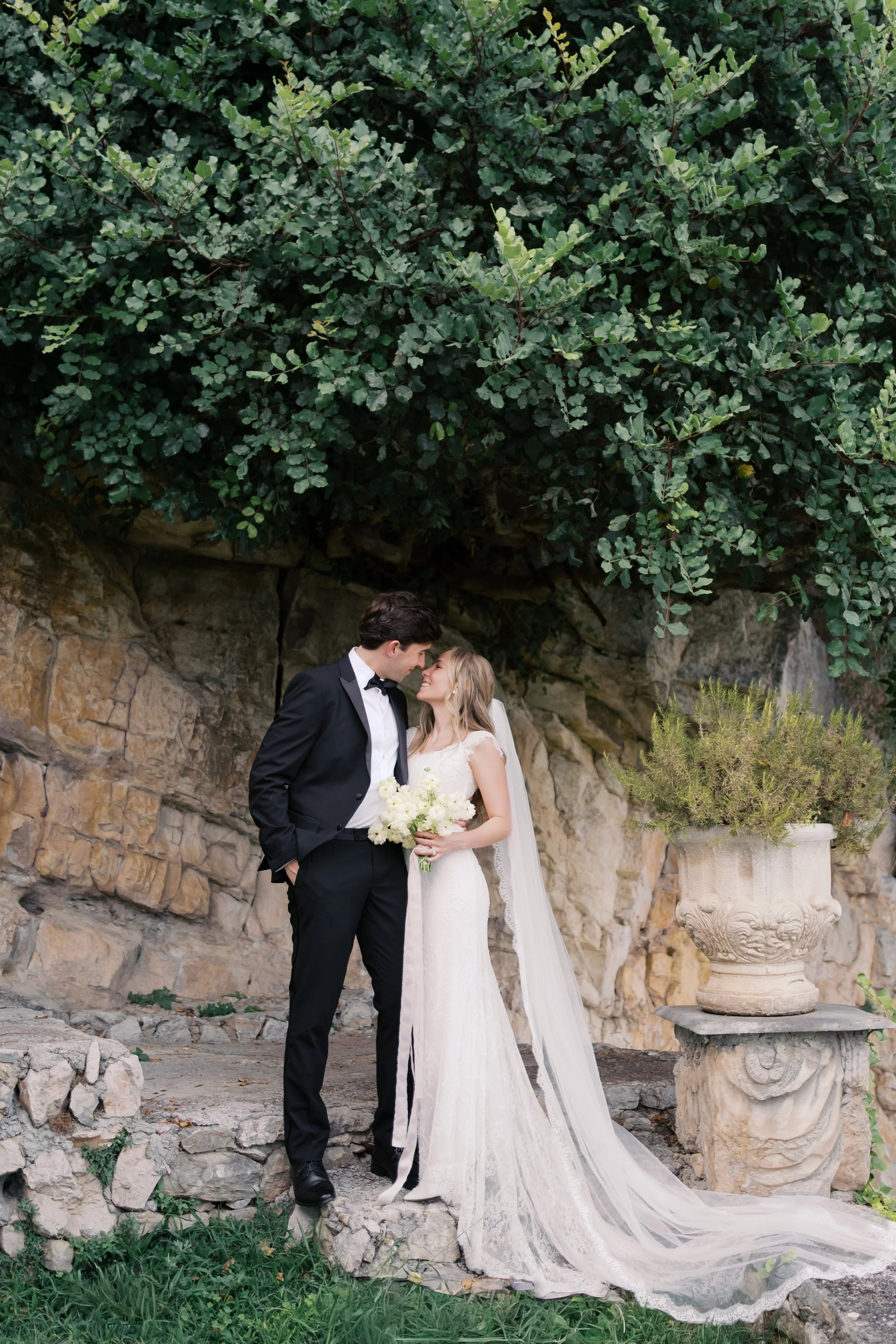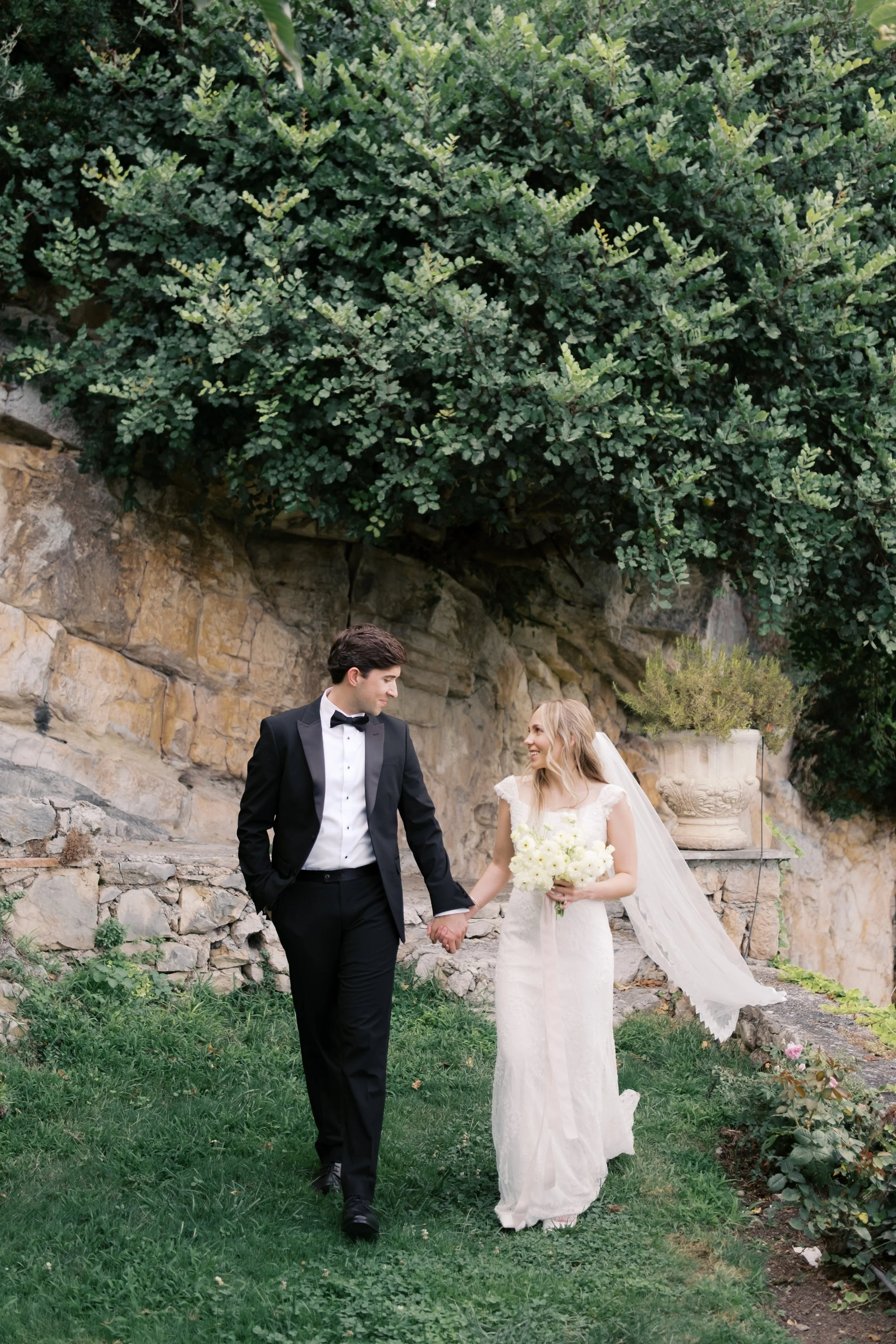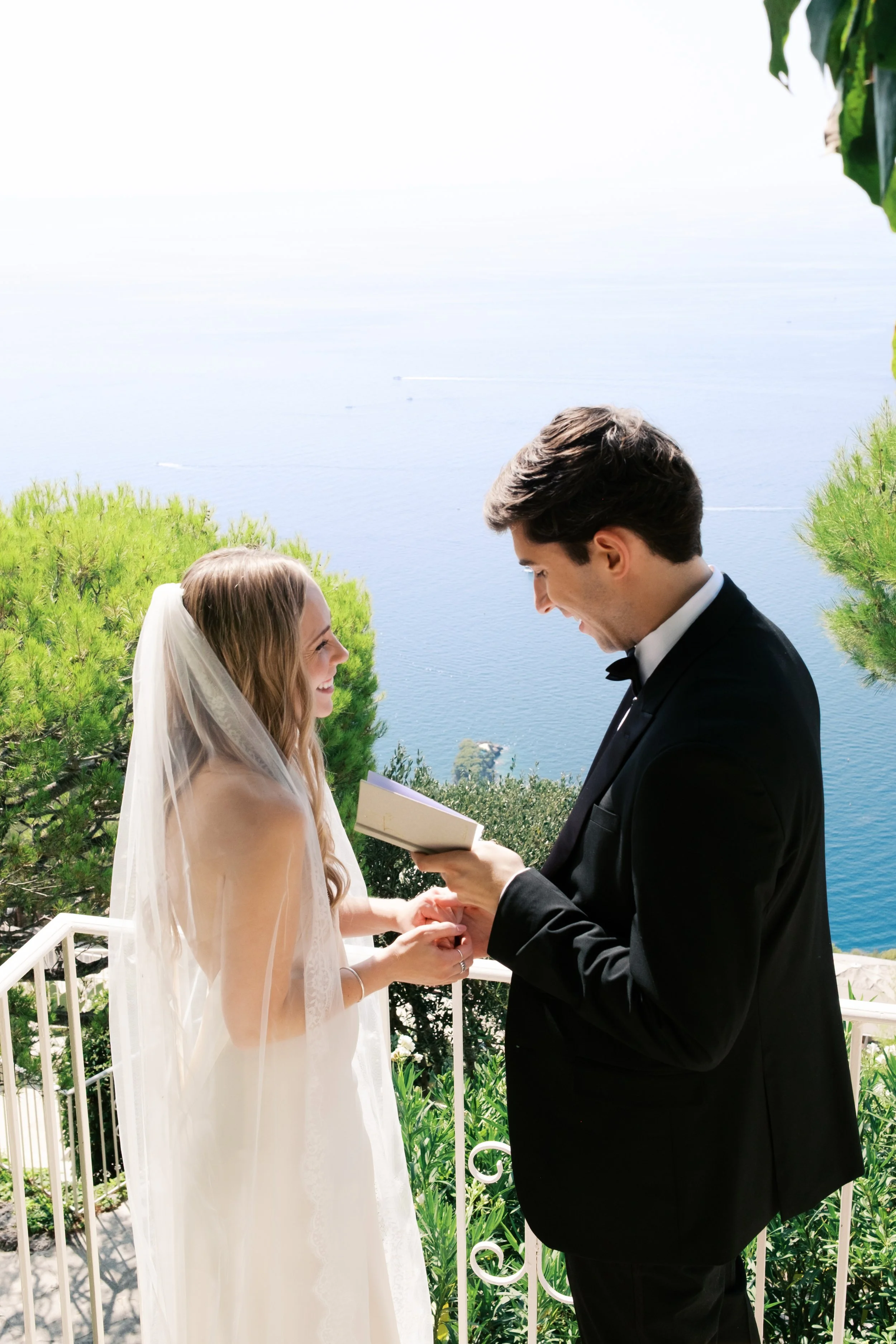 Despite starting well before sunrise, it’s probably no surprise that our wedding day wasn’t hard to wake up for. I got ready on our room’s deck with a view of the sunrise over the Mediterranean (which felt exactly how it sounds). The sun was sparkling over the water while I powdered eyeshadows and blushes to work on my own bridal glow. I was so relaxed that I ran a bit late for photos in the village! When we got back from the village, we captured these portraits in our pink, marble, bathroom while I did a round of touch ups on my face and hair. We laughed off my hair’s unwillingness to hold a curl regardless of the can of hair spray I ran through that morning. It gave us a chance to embrace the French c'est la vie, and roll out with a carefree version of bridal hair.